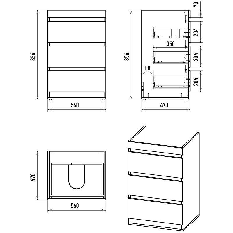 Габариты корпуса тумбы (ШхВхГ): 560х856х470 мм.