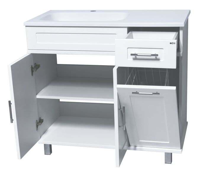 Напольная тумба под раковину Misty Купер 90см левая с бельевой корзиной белый