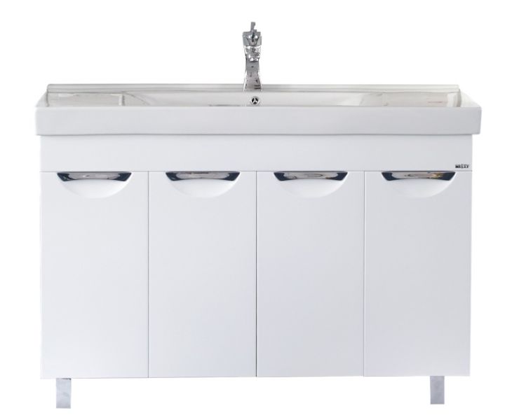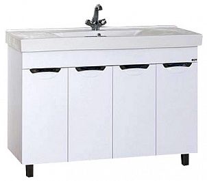 - Вместительной прямой тумбой с просторными отделениями за четырьмя распашными дверками. Модель поставляется в комплекте с прямоугольной доломитовой раковиной-столешницей MISTY 120 с одной чашей или раковиной STEP 120 с двумя чашами.