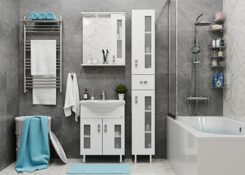 Белоснежный глянцевый цвет фасада в сочетании со вставками из матового стекла и хромированными ручками необычной формы придадут ванной комнате ощущение свежести, чистоты и уюта.