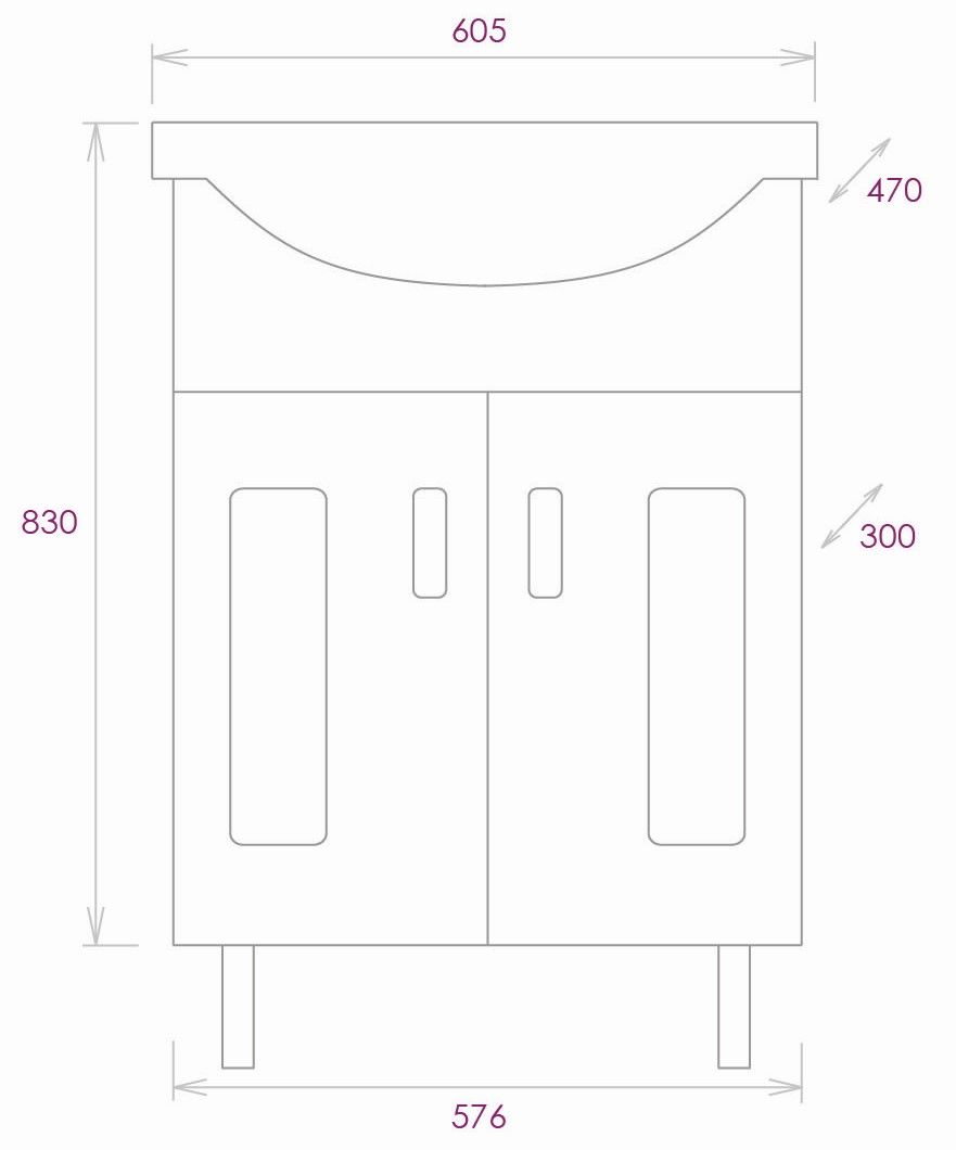 Размеры тумбы без учета раковины и ножек: 58x30x68 см.