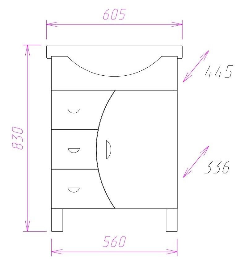 Размеры тумбы без учета раковины и ножек 56х34х68 см.