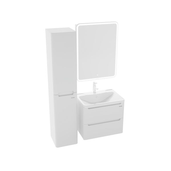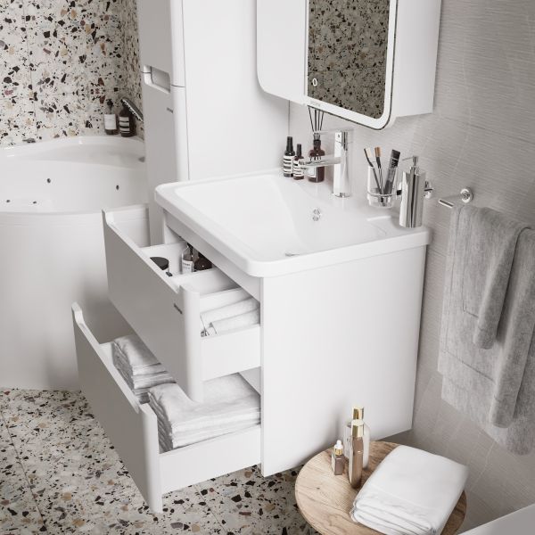 Одно большое отделение с двумя распашными дверцами, оснащенными системой плавного закрывания, пространство внутри которого разделено полкой, позволит вместить все необходимые в ванной мелочи.
