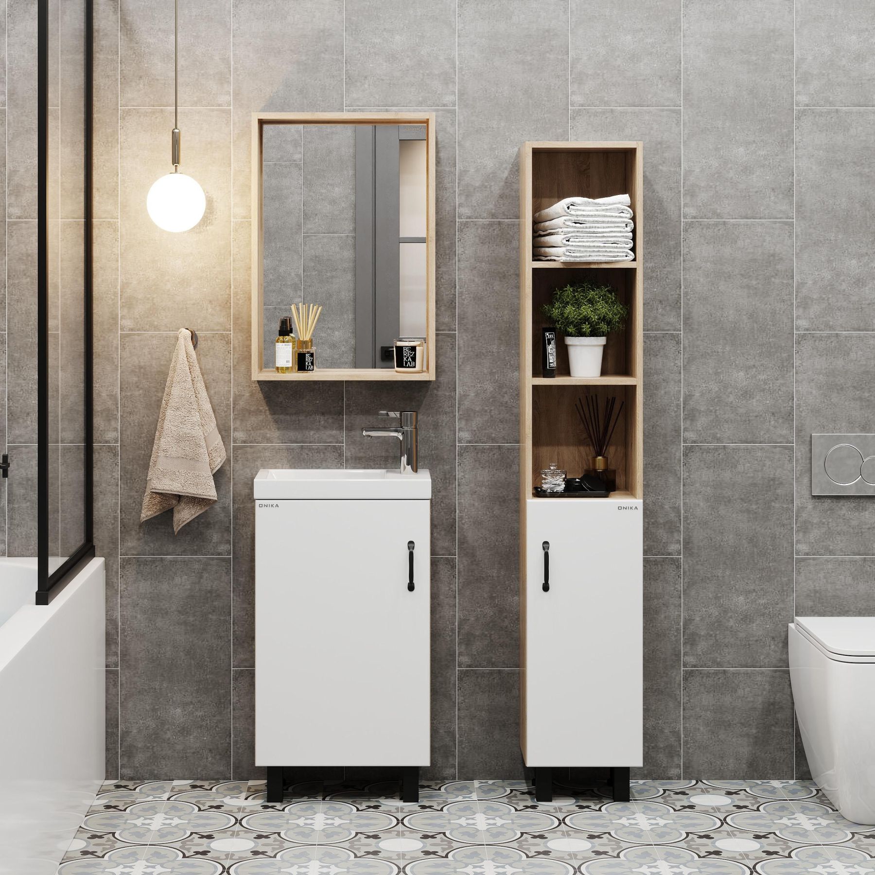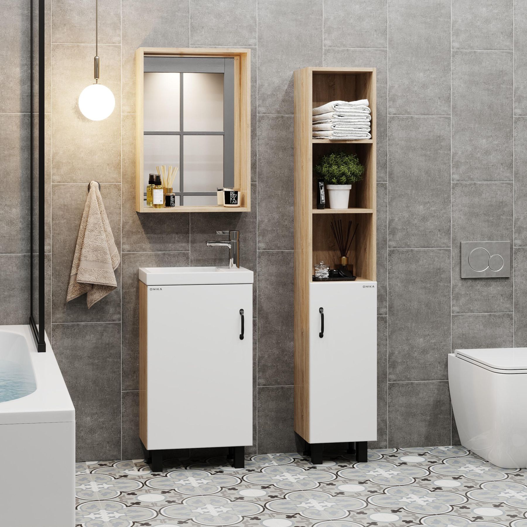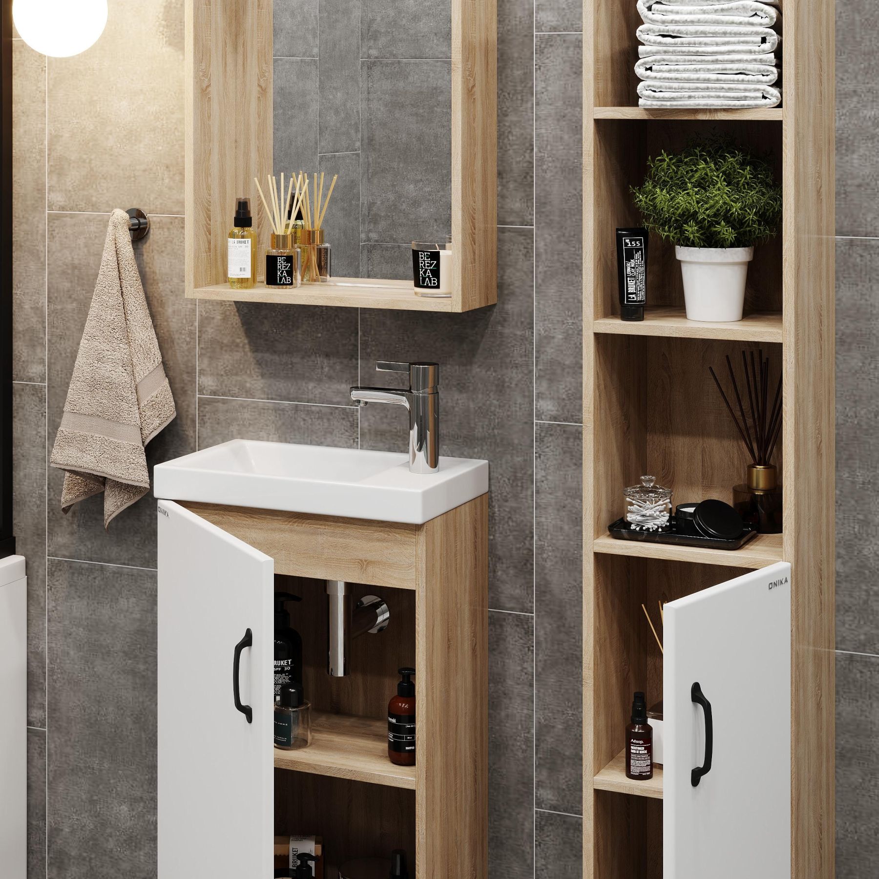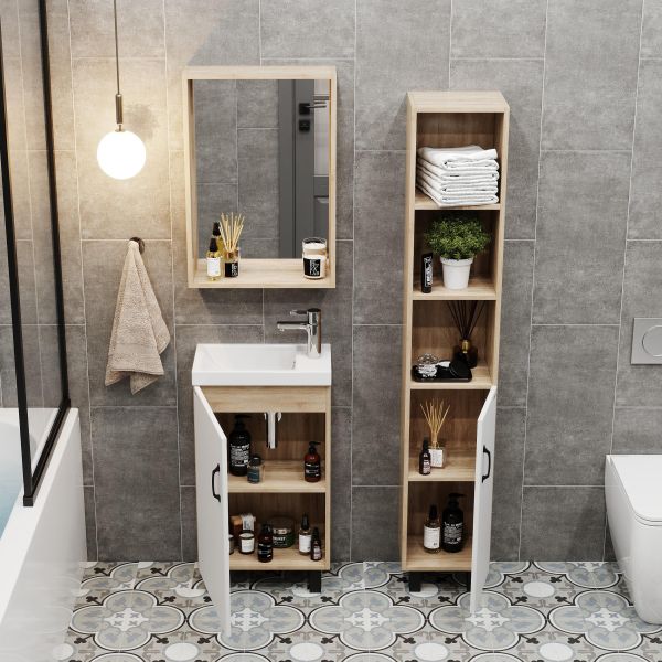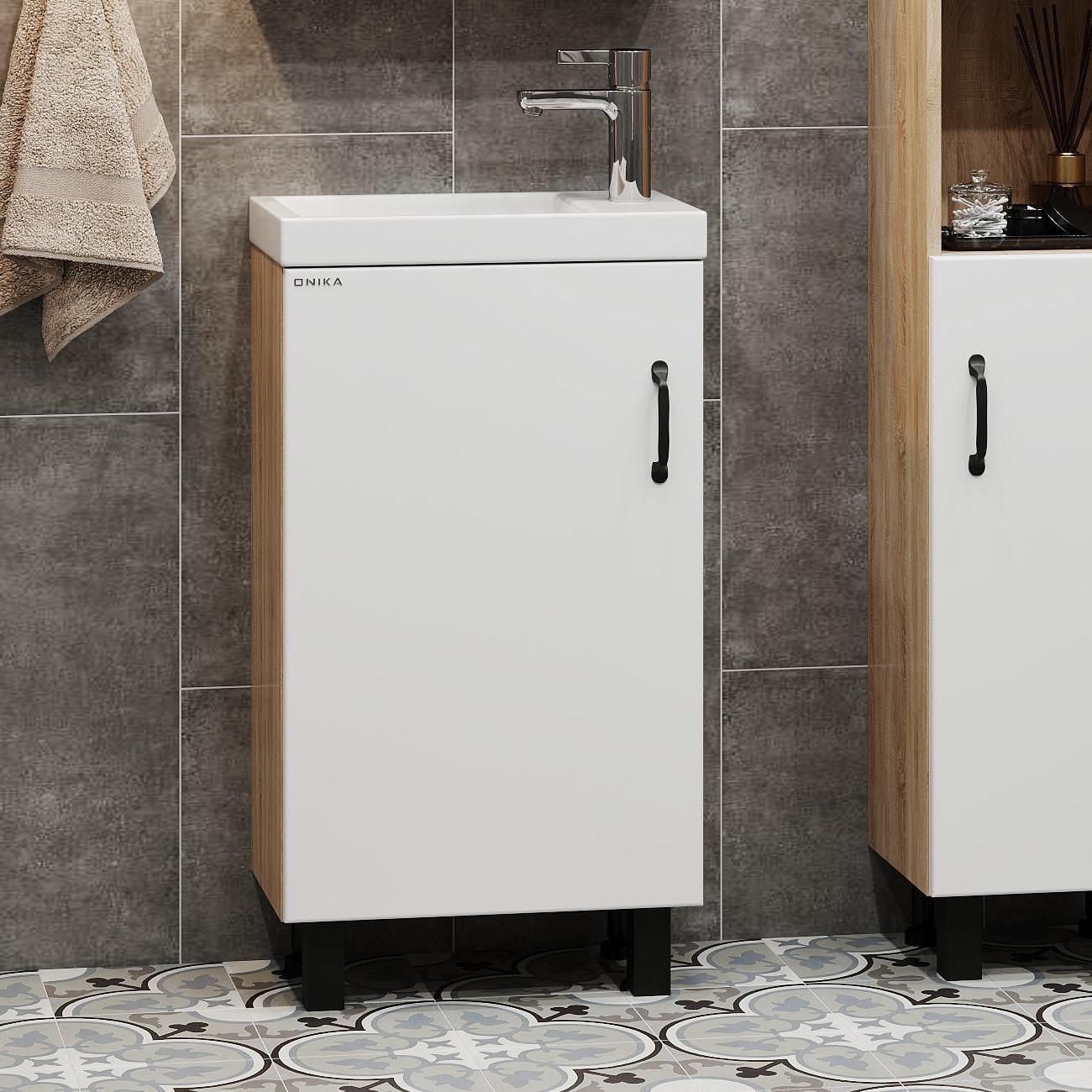 В тумбе Onika Тимбер 45 удачно сочетаются контрастные цвета и фактуры: белый матовый фасад с покрытием SoftTouch, корпус цвета дуба с роскошной текстурой, черная матовая металлическая фурнитура.