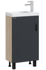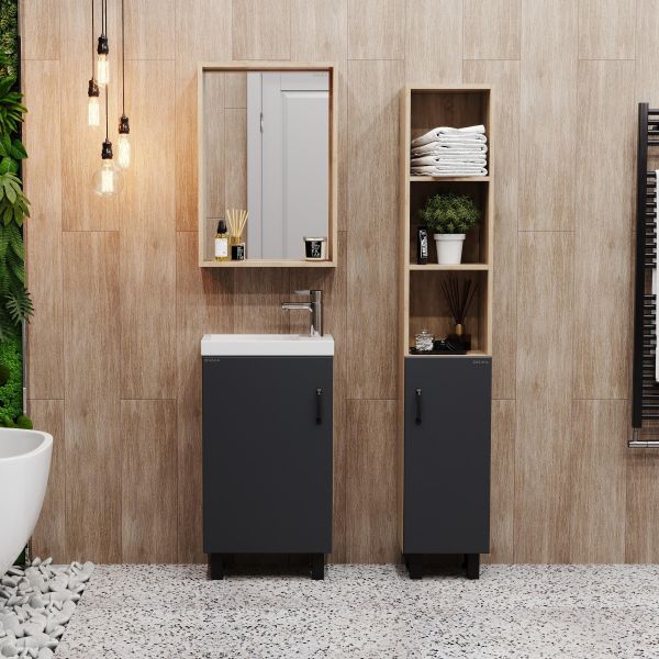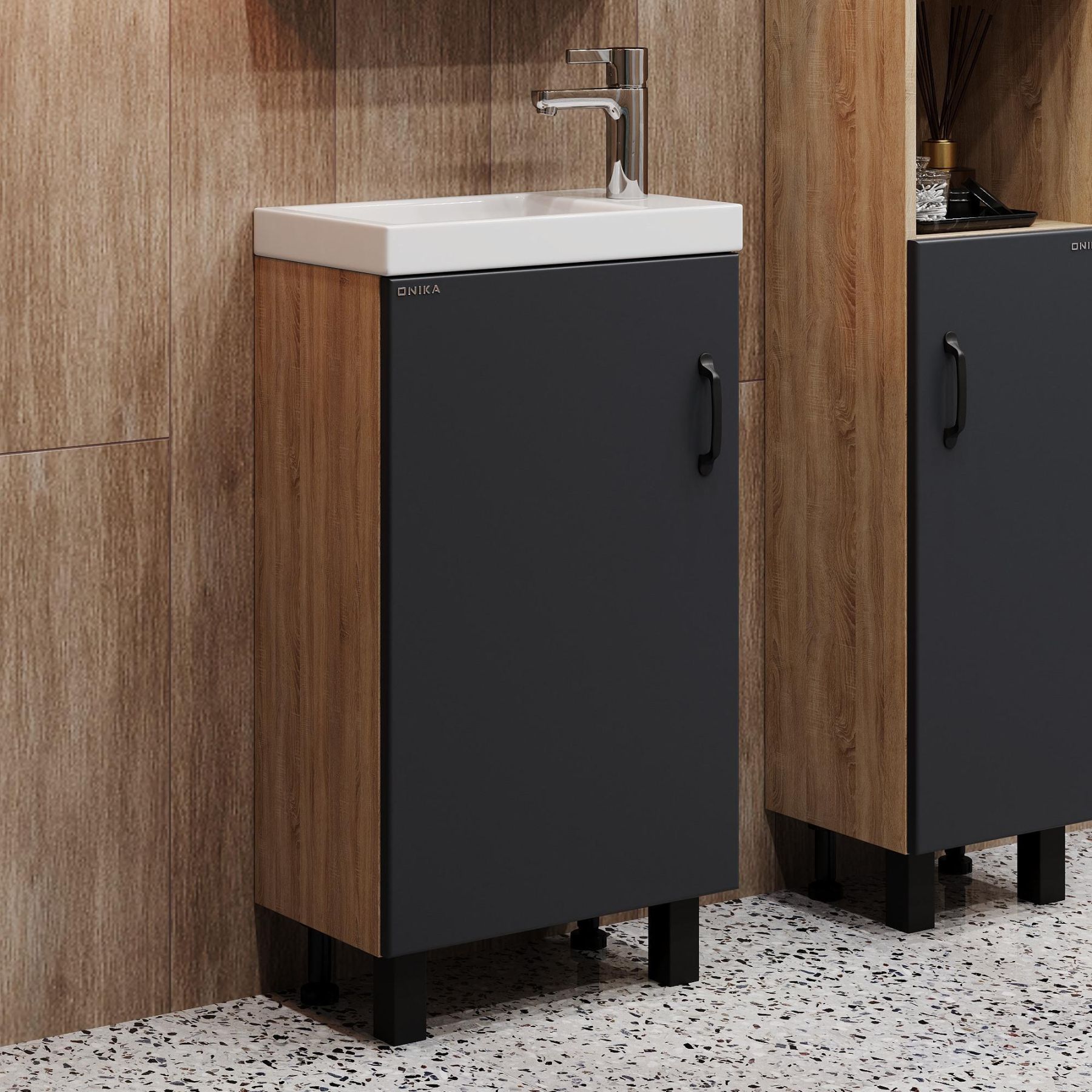 В тумбе Onika Тимбер 45 удачно сочетаются контрастные цвета и фактуры: серый матовый фасад с покрытием SoftTouch, корпус цвета дуба с роскошной текстурой, черная матовая металлическая фурнитура.