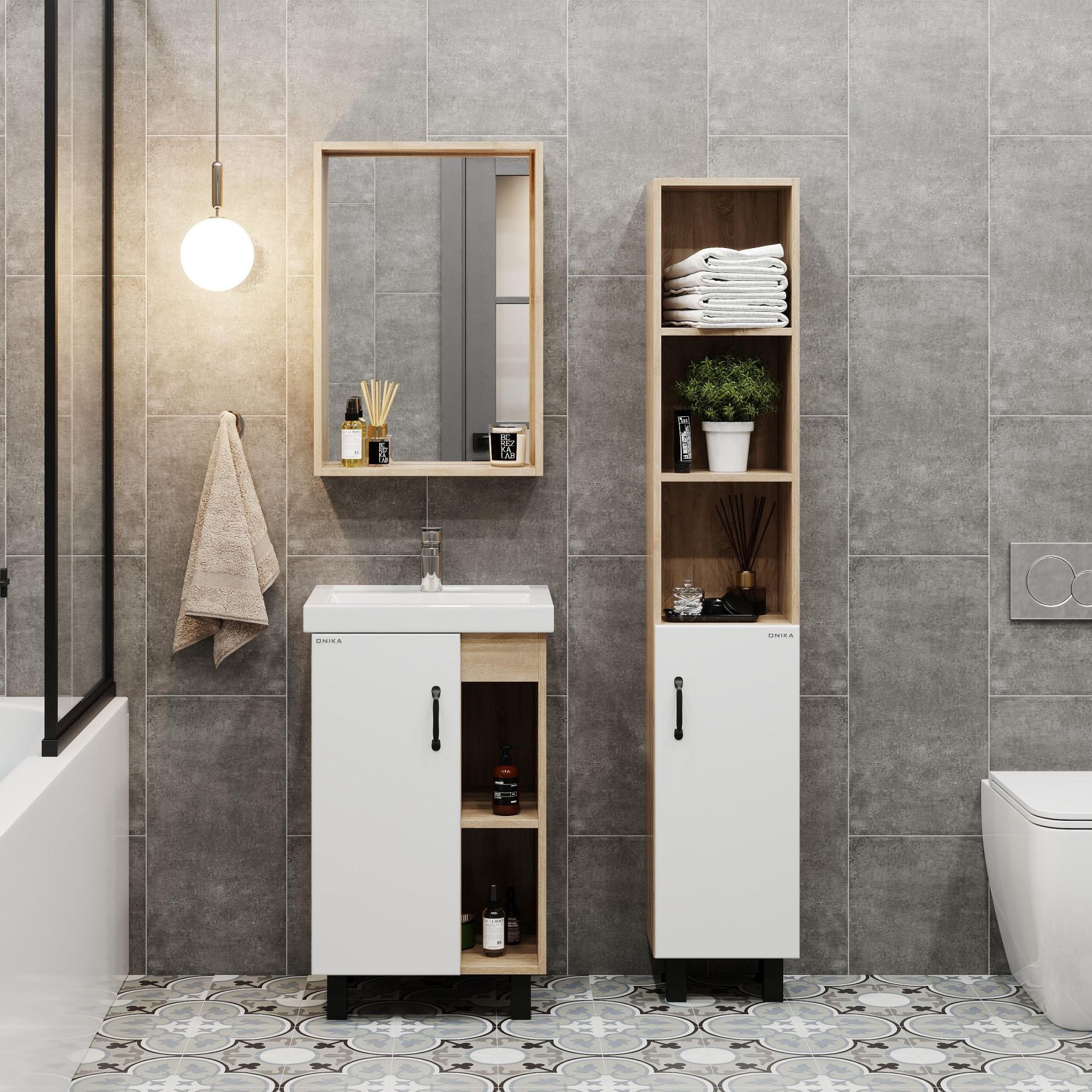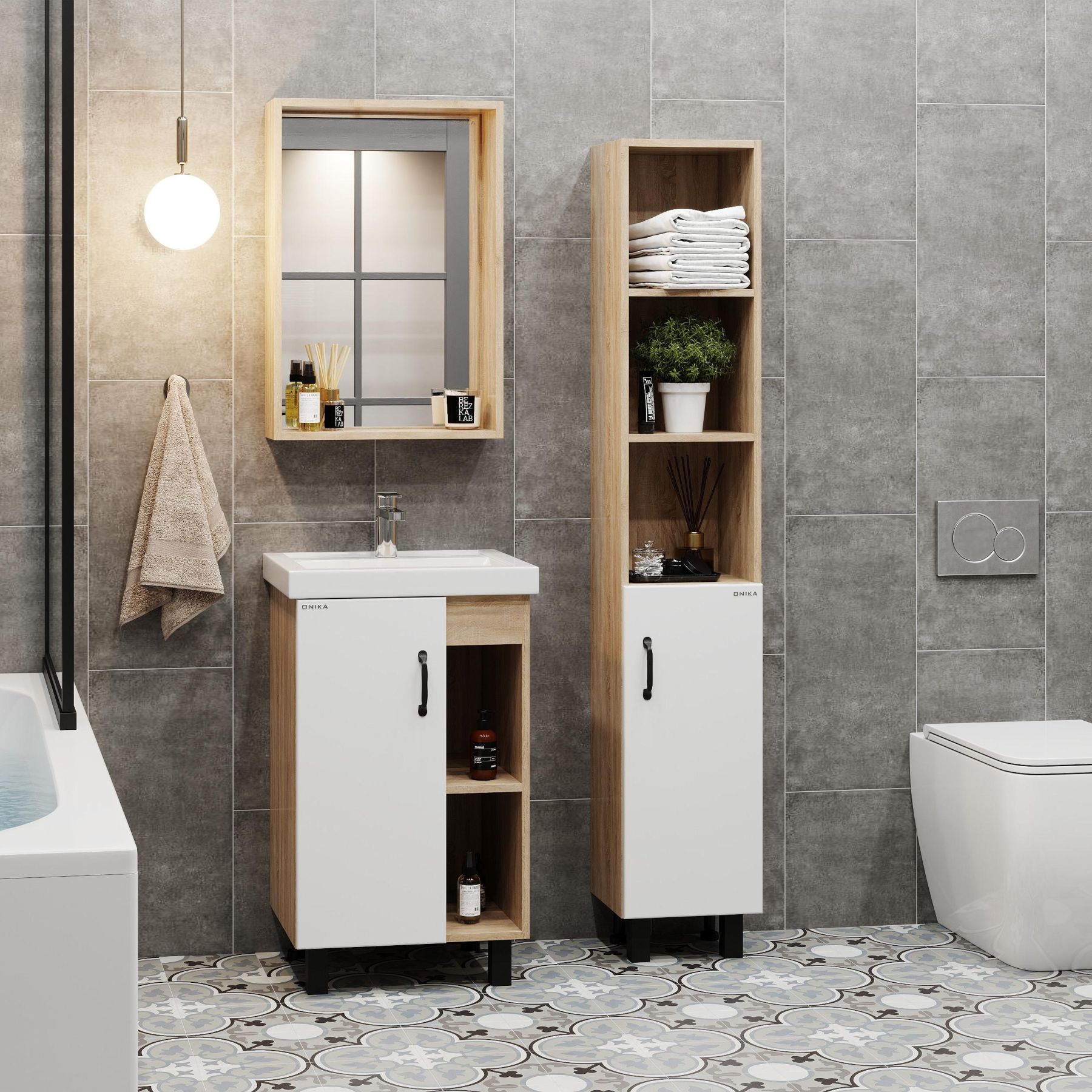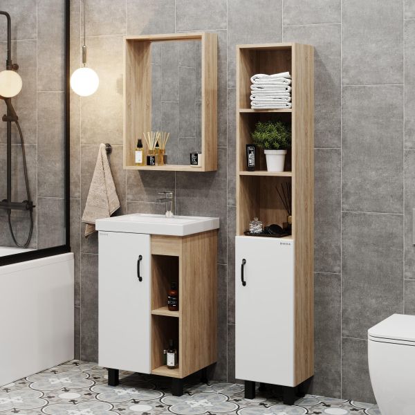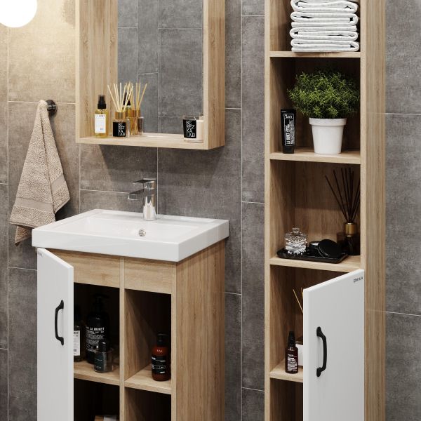 В тумбе Onika Тимбер 50 удачно сочетаются контрастные цвета и фактуры: белый матовый фасад с покрытием SoftTouch, корпус цвета дуба с роскошной текстурой, черная матовая металлическая фурнитура.