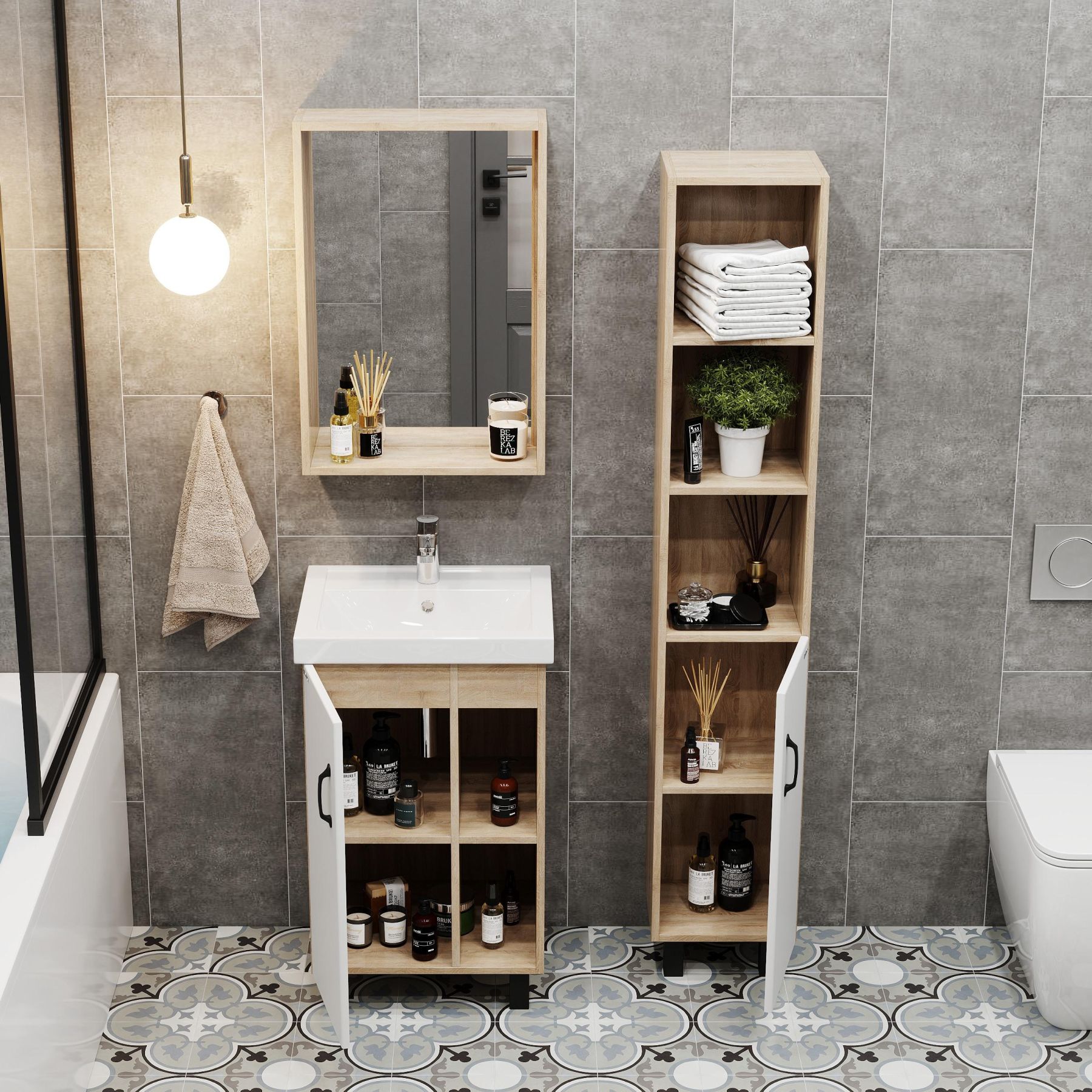 Открытые полки справа обеспечивают быстрый доступ к часто используемым аксессуарам, а пространство за распашной дверцей слева, снабженной системой плавного закрывания, станет удобным местом для хранения различных бытовых принадлежностей.