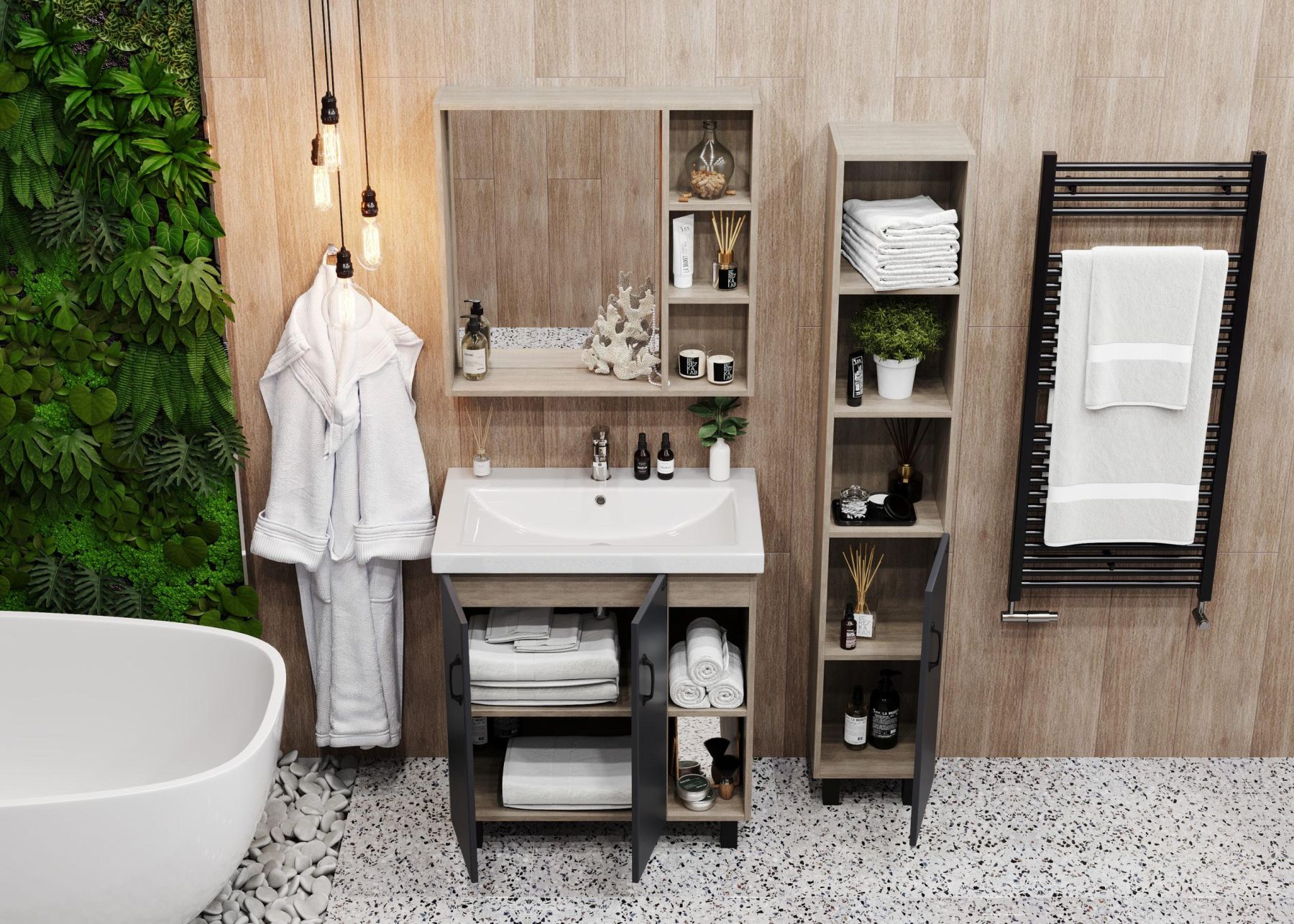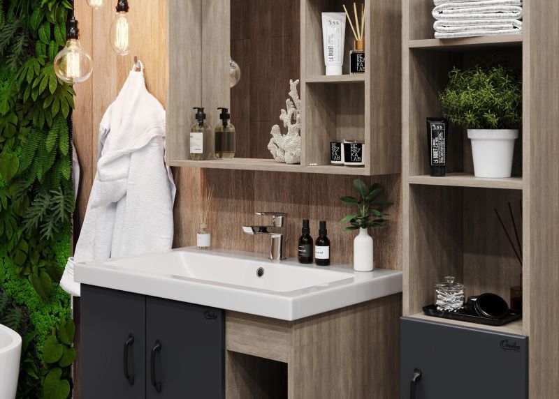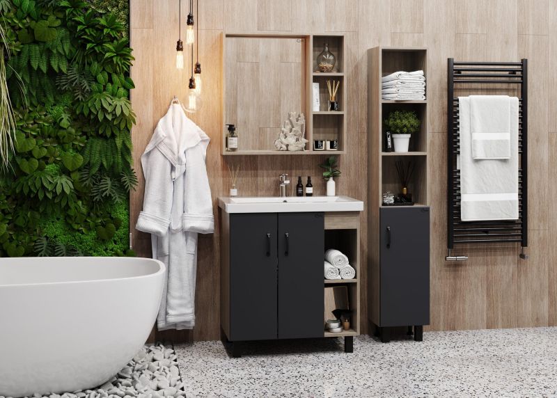 В тумбе Onika Тимбер 70 удачно сочетаются контрастные цвета и фактуры: серый матовый фасад с покрытием SoftTouch, корпус цвета дуба с роскошной текстурой, черная матовая металлическая фурнитура.