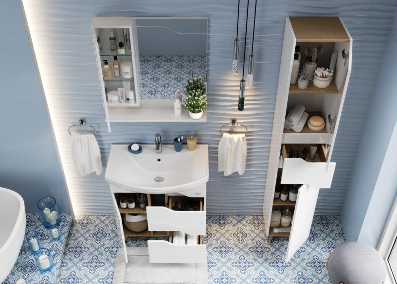 Два вместительных ящика, снабженные направляющими полного выдвижения, помогут организовать пространство в ванной комнате и компактно разместить необходимые вещи, а распашная дверь слева, оснащенная системой открывания push-to-open, скрывает дополнительное место для хранения.