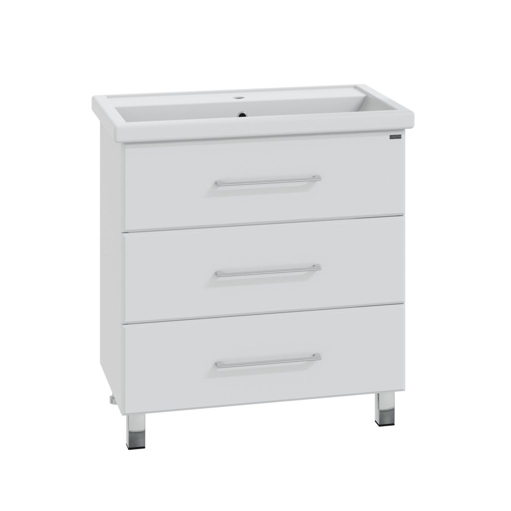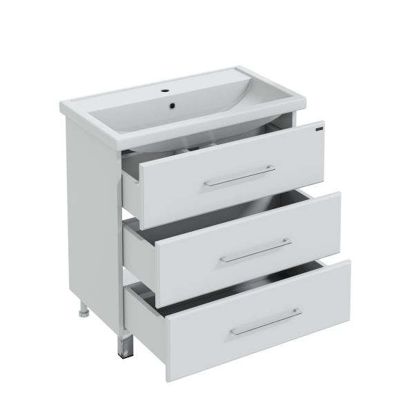 Тумба напольная Омега 80 для умывальника Фостер 80. Корпус изделия выполнен из влагостойкого ЛДСП, фасад из МДФ и покрыт пленкой. Выдвижные ящики тумбы оснащены шариковыми направляющими полного выдвижения.