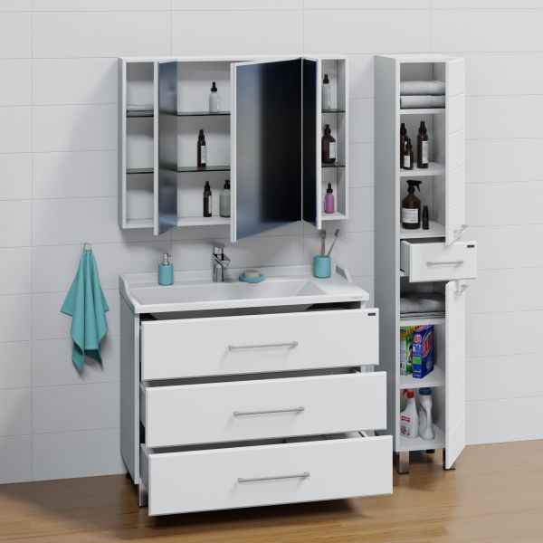 Тумба напольная Омега 100 для умывальника Sirius 100. Корпус изделия и фасад выполнен из МДФ. Фасад и боковины мебели покрыты глянцевой ПВХ плёнкой.Выдвижные ящики тумбы оснащены шариковыми направляющими полного выдвижения.