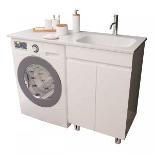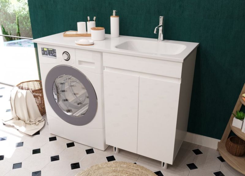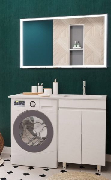 Тумба укомплектована раковиной из литьевого мрамора c глубокой чашей, плавными изгибами и вкладышем для слива. Раковина с большой столешницей удобная и функциональная. В тумбе 2 распашных дверцы со скрытыми ручками и полкой внутри, что делает использование максимально комфортным. Стиральная машина устанавливается под столешницей, за счет чего экономит место в ванной комнате.