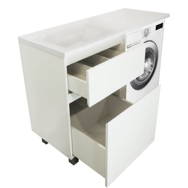 Коллекция мебели для ванной комнаты Dallas Luxe покоряет своей удивительной простой и функциональностью. Стильная лаконичная тумба, укомплектована раковиной из литьевого мрамора с удобной чашей. Стиральная машина устанавливается под столешницей, за счет чего экономит место в ванной комнате. В тумбе имеются два ящика. Нижний ящик тумбы – широкий и вместительный – предназначен для крупных предметов, а в верхнем имеется специальная организация пространства, позволяющая хранить мелкие вещи.
