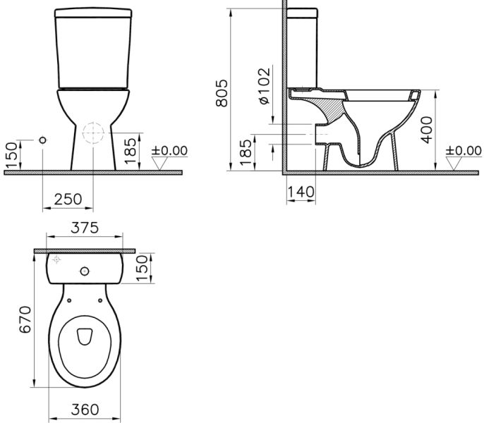 • Прилегание унитаза к стене: