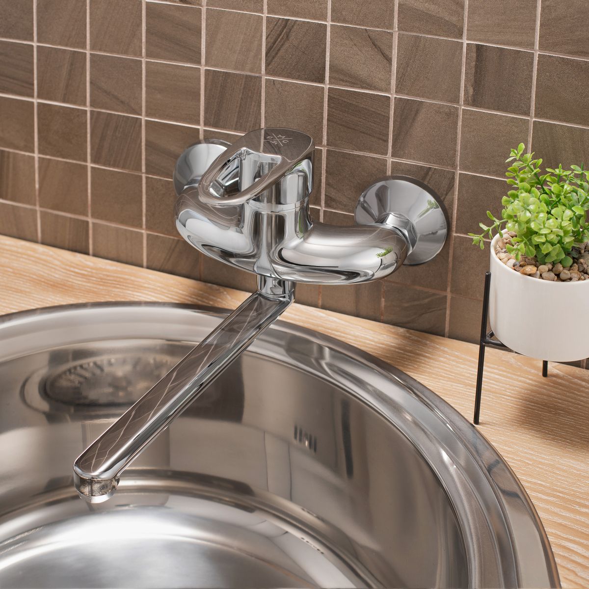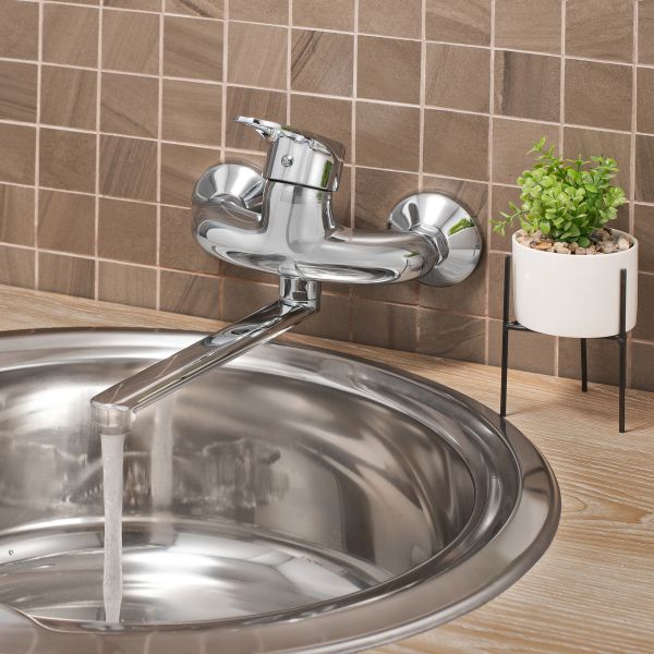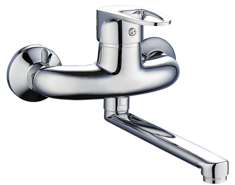 Настенный одноручковый смеситель для кухни с длинным поворотным изливом — это сочетание современных, стильных линий и надежного качества в эксплуатации.