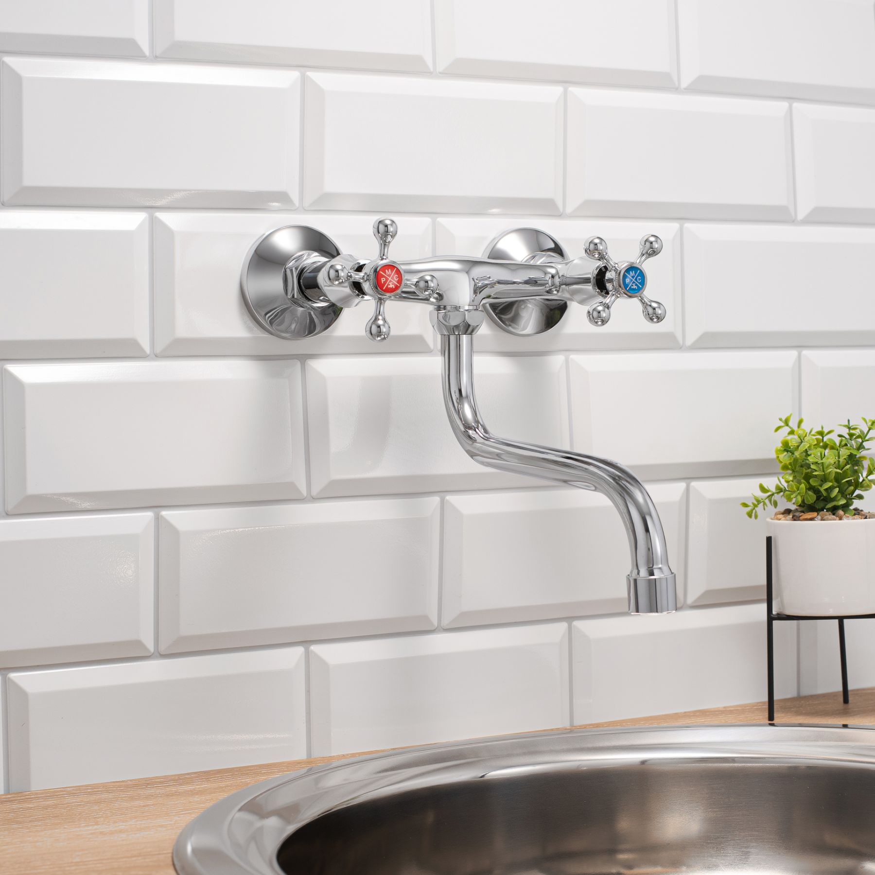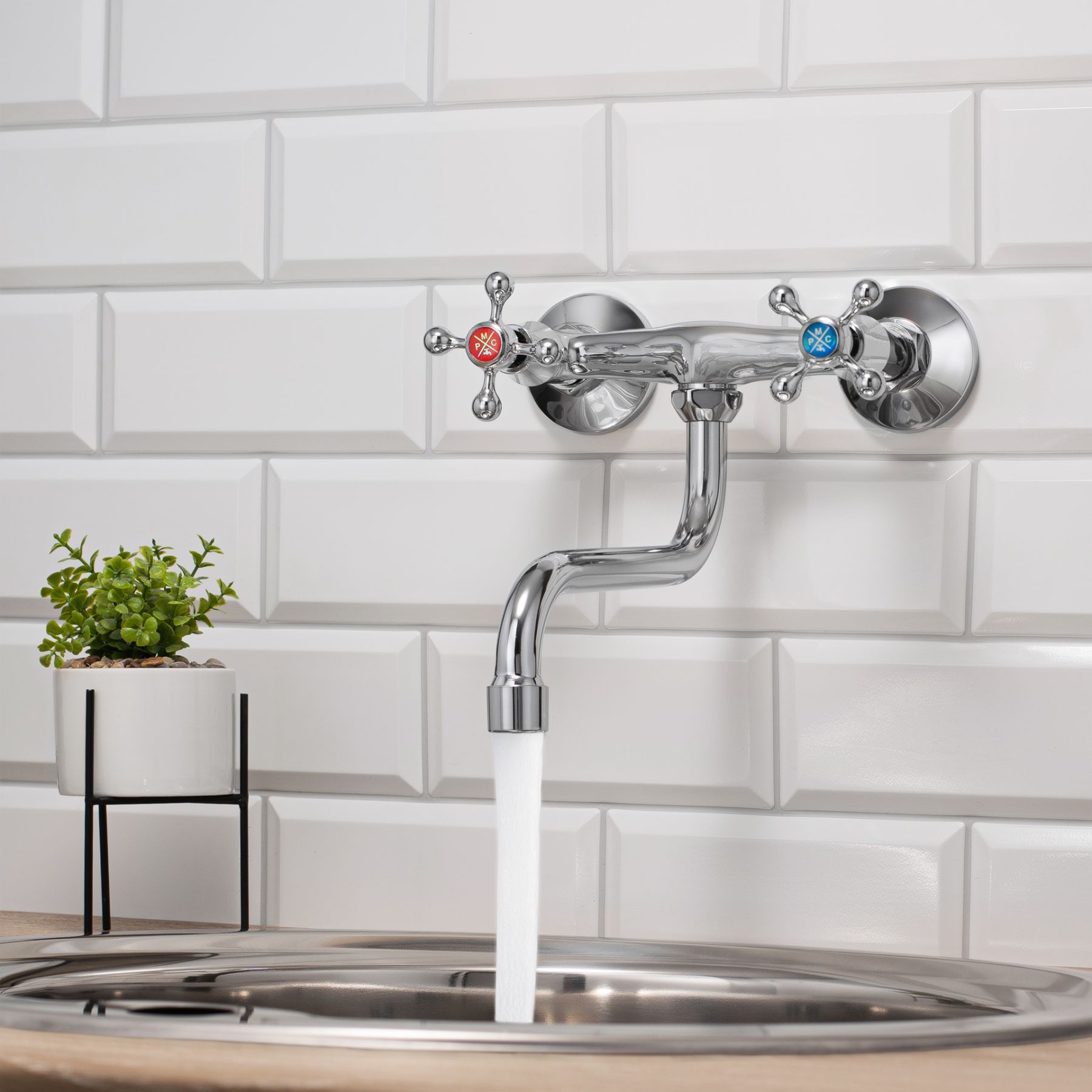 Настенный двуручковый смеситель для кухни с длинным поворотным изливом - оригинальная, функциональная модель, которая удачно сочетает в себе качество и стиль.