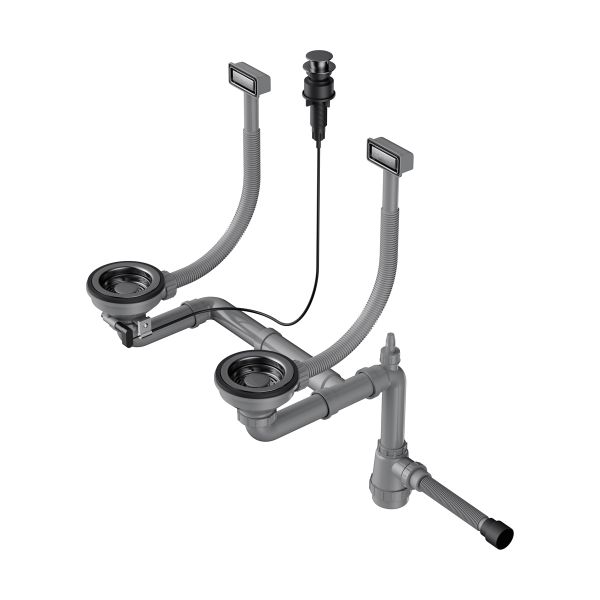 Арматура для двухчашевых моек с прямоугольными переливами, декоративными решетками и клапаном-автомат. Подходит для моек из серии AKISAME.