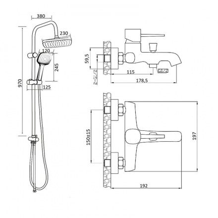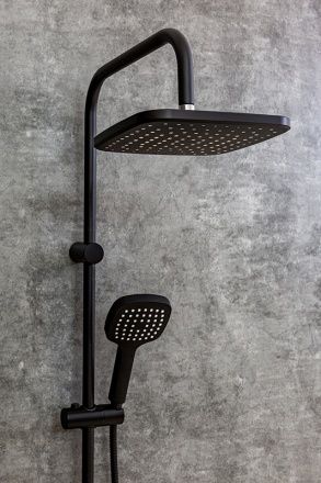 Душевая система с смесителем для ванны/душа в цвете черный матовый: верхний душ (230х230 мм) создаёт эффект тропического дождя, что дарит непередаваемые эмоции во время ежедневных банных процедур. Ручной душ 120 мм (1 режим) на гибком полутораметровом шланге (в металлической оплетке) с защитой от перекручивания. Держатели верхнего и ручного душа с регулировкой угла наклона, штанга 970 мм. Подвижные детали отличаются долговечностью. Фиксируется душевая система непосредственно на стене, что позволяет рационально использовать ограниченное пространство ванной комнаты. Модное на сегодняшний день покрытие чёрного цвета, за которым просто ухаживать мягкой салфеткой, получено порошковой окраской с многоступенчатой системой подготовки и высокотемпературной обработкой.