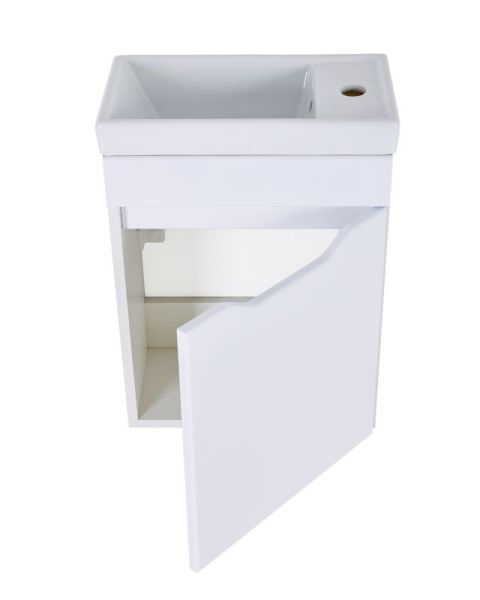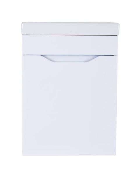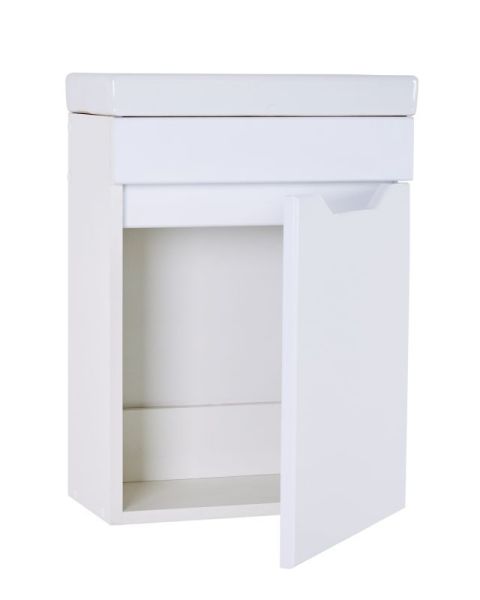 Тумба с раковиной Orange Мини, 40 см, подвесная, белый, Mini-40TUW+RaТумба подвесная с раковиной правосторонняя (петли справа) Orange МИНИ отличается дизайном в стиле минимализм. Предназначена для использования в помещениях с повышенной влажностью. Дверца с механизмом доводчика, обеспечивающим плавное закрывание. Материал фасада МДФ - белый глянец, материал корпуса ЛДСП - белый матовый. Раковина Енисей 40 универсальная, материал фаянс, встроенный слив-перелив. Тумба поставляется в разобранном виде.Комплектация: тумба, раковина, инструкция.