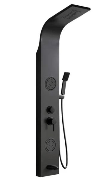 - Комплектация: душевая панель, душевая лейка, смеситель, шланг для душа, верхний душ, крепеж, инструкция