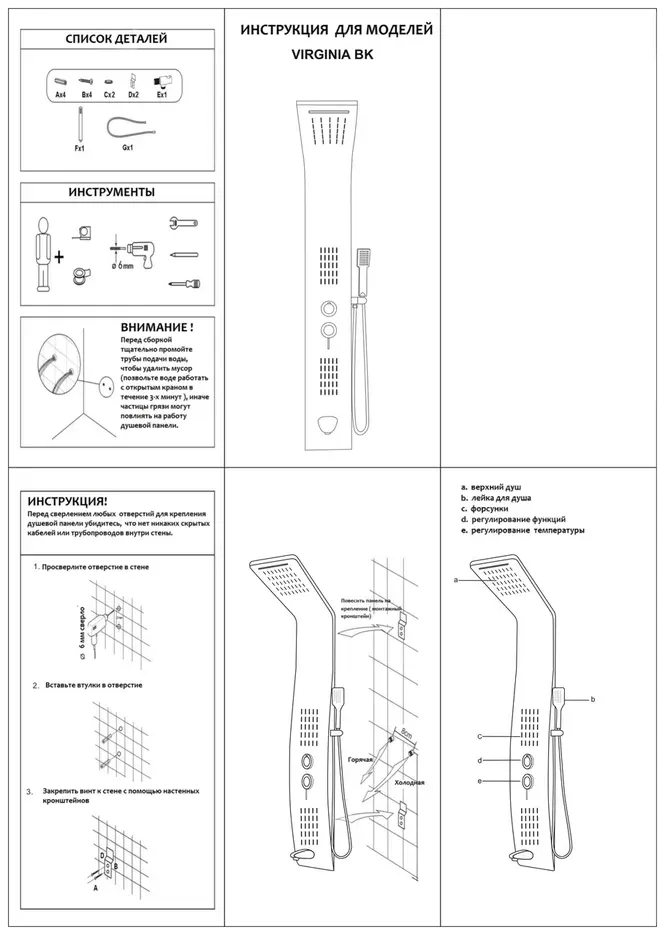 - Комплектация: душевая панель, душевая лейка, смеситель, шланг для душа, верхний душ, крепеж, инструкция