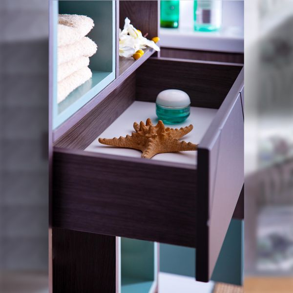 Основное преимущество шкаф-пенала заключается в его вместительности. Удобные полки и ящики позволяют организовать пространство и разместить все необходимое: от косметики до бытовых принадлежностей. Каждая деталь продумана для удобства использования, что делает утренние и вечерние ритуалы более приятными.