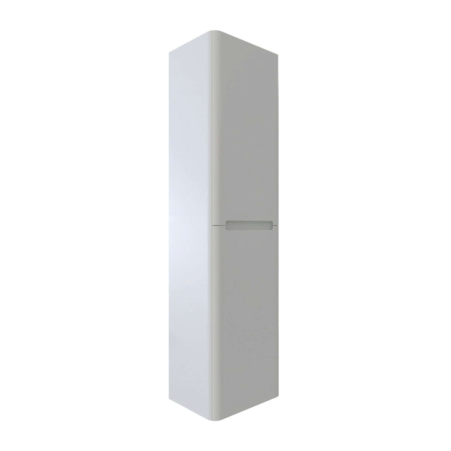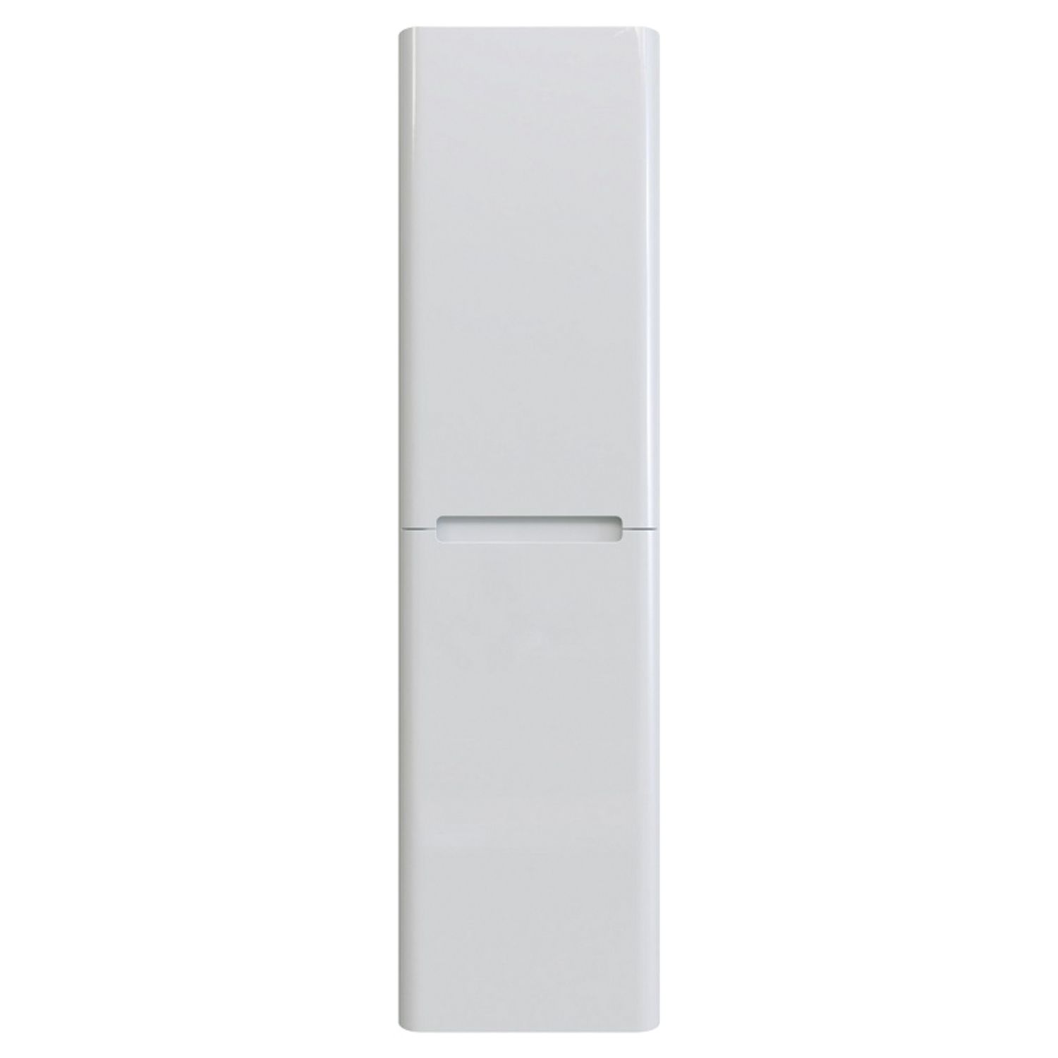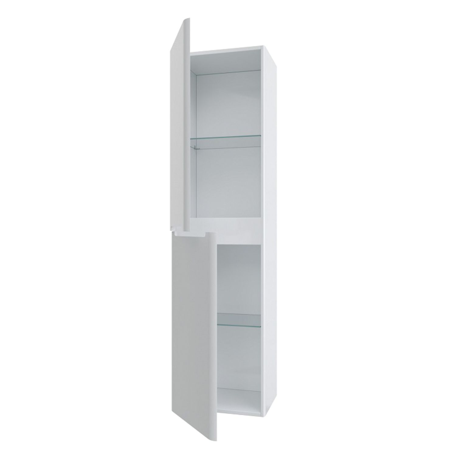 Пенал для ванной комнаты, подвесной. Размеры: 300х400х1500 мм (ДхШхВ). Универсальная ориентация. Фасады МДФ 19 мм в эмали (цвет белый глянец), фрезеровка. Корпус ЛМДФ 16 мм в эмали. Две дверцы с интегрированными ручками. Стеклянные полки 4 мм с фиксаторами. Петли с доводчиками. Упаковка: картон, пленка, пенопластовые уголки.