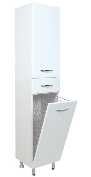 Большое отделение сверху за распашной дверцей с механизмом плавного закрывания, небольшой ящик с направляющими полного выдвижения посередине и отделение с корзиной для белья внизу шкафа обеспечит бережное хранение всех необходимых в ванной комнате вещей. Размер бельевой корзины: 250*265*640.