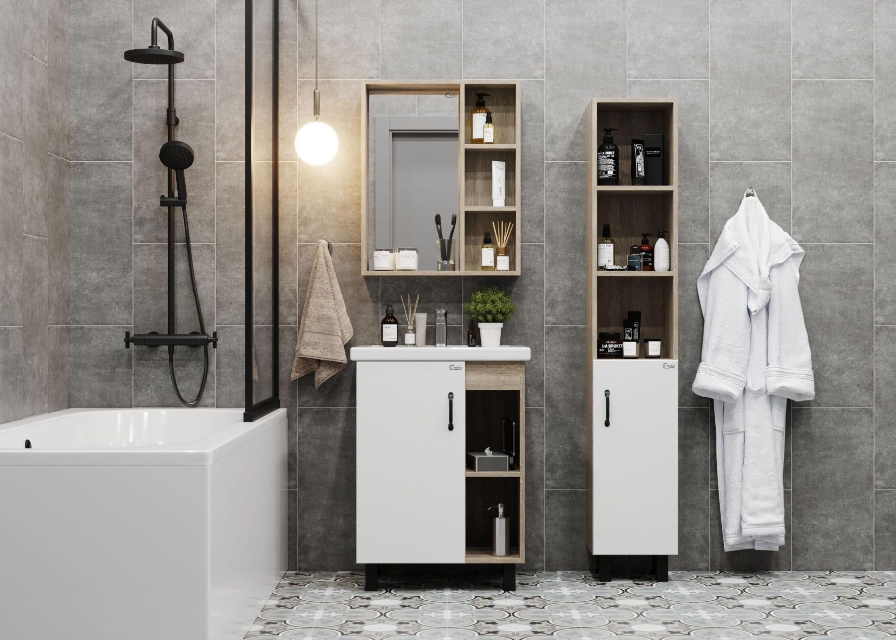 Напольный пенал для ванной комнаты пенал Onika ТИМБЕР 30 удачно сочетает в себе контрастные цвета и фактуры: белый матовый фасад с покрытием SoftTouch, корпус цвета дуб сонома с роскошной текстурой, черная матовая металлическая фурнитура.