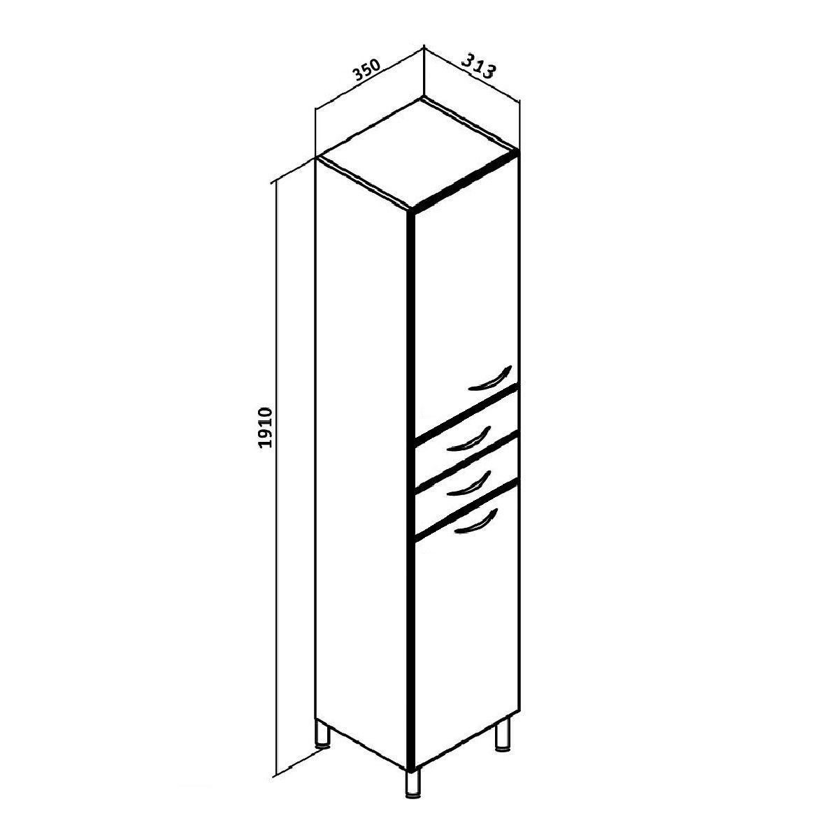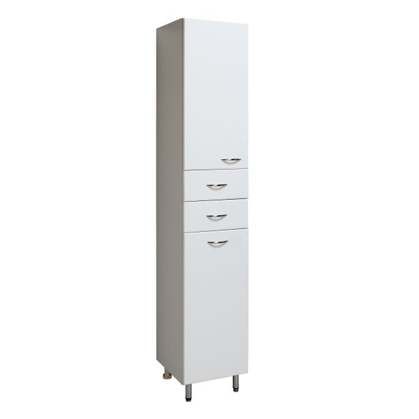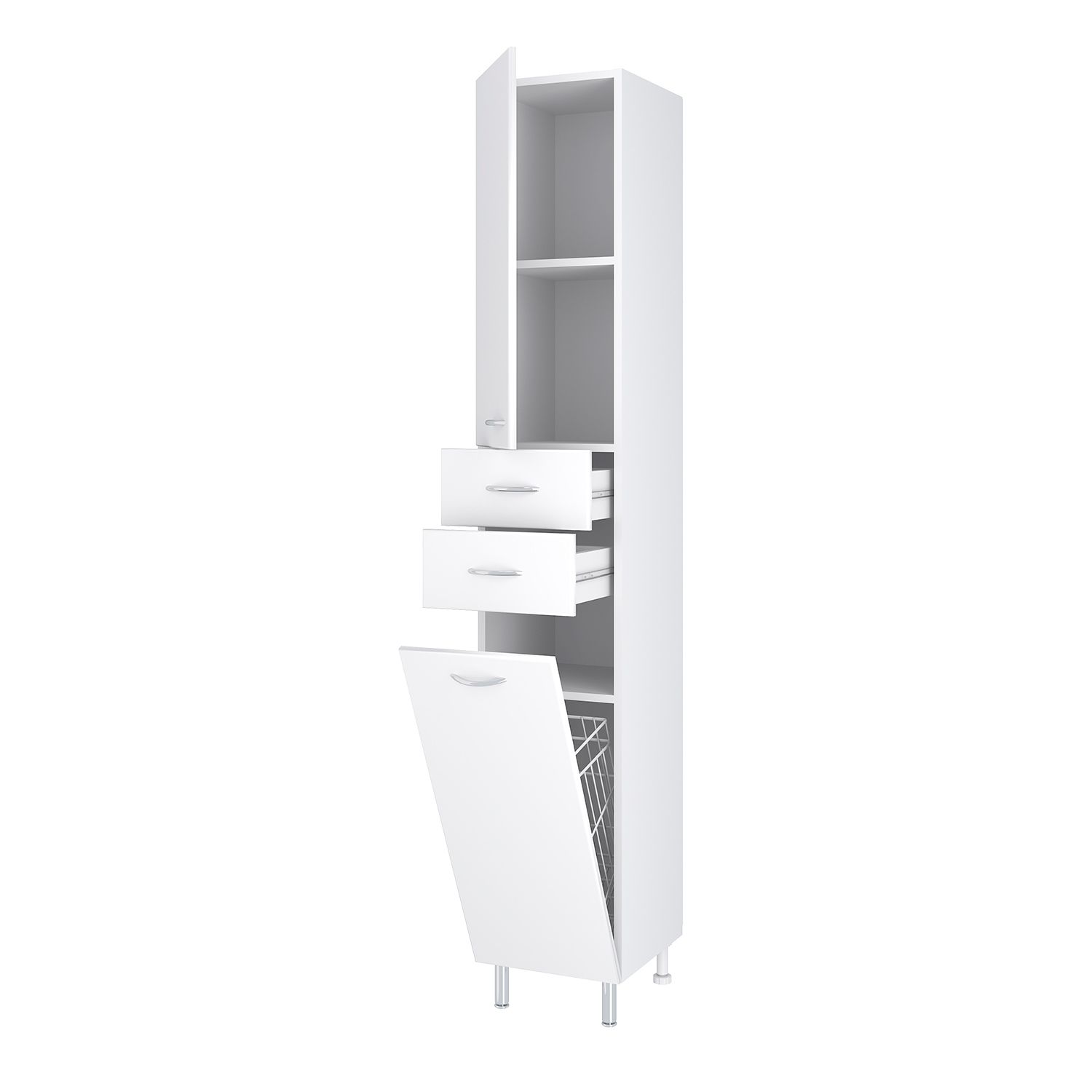 Шкаф-колонна напольный с двумя отделениями и выдвижными ящиками. Верхнее отделение с распашной дверкой и одной внутренней полкой. Нижнее отделение - с откидной дверью. Комплектуется полкой и корзиной для белья. Ящики - на шариковых направляющих, петли со встроенным доводчиком, ручки - 4 шт, ножки хром - 2 шт, ножки пластик -2шт.