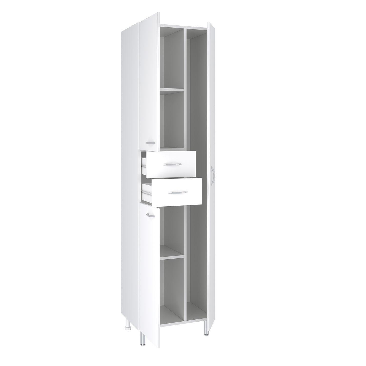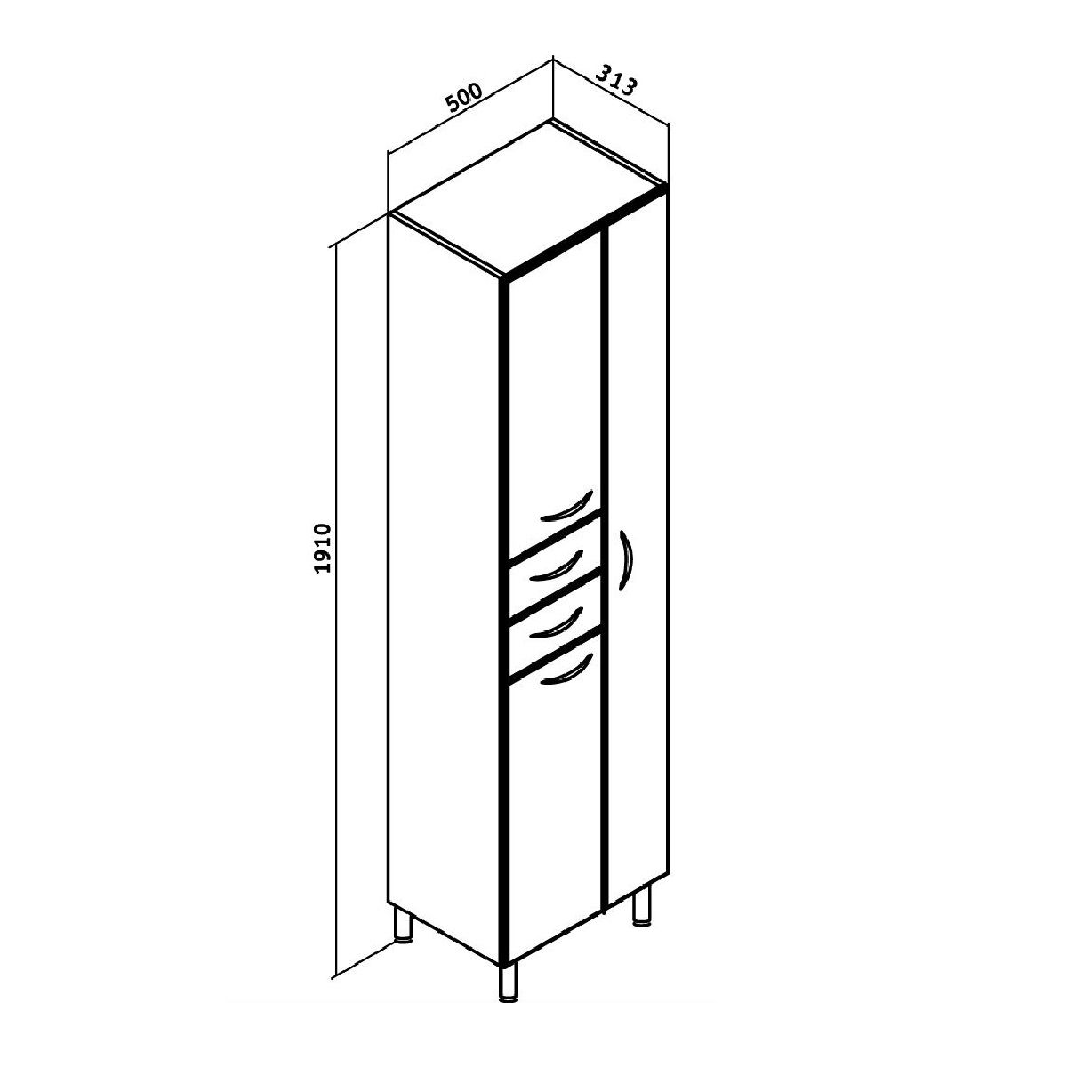 Шкаф-колонна напольный, справа - отделение для халатов с распашной дверью, слева -две дверцы и два выдвижных ящика. В нижнем и верхнем отделениях - по одной внутренней полке. Ящики - на шариковых направляющих, петли со встроенным доводчиком, ручки - 5шт, крючок - 1шт, ножки хром - 2 шт, ножки пластик -2шт. Выпускается только в правом исполнении