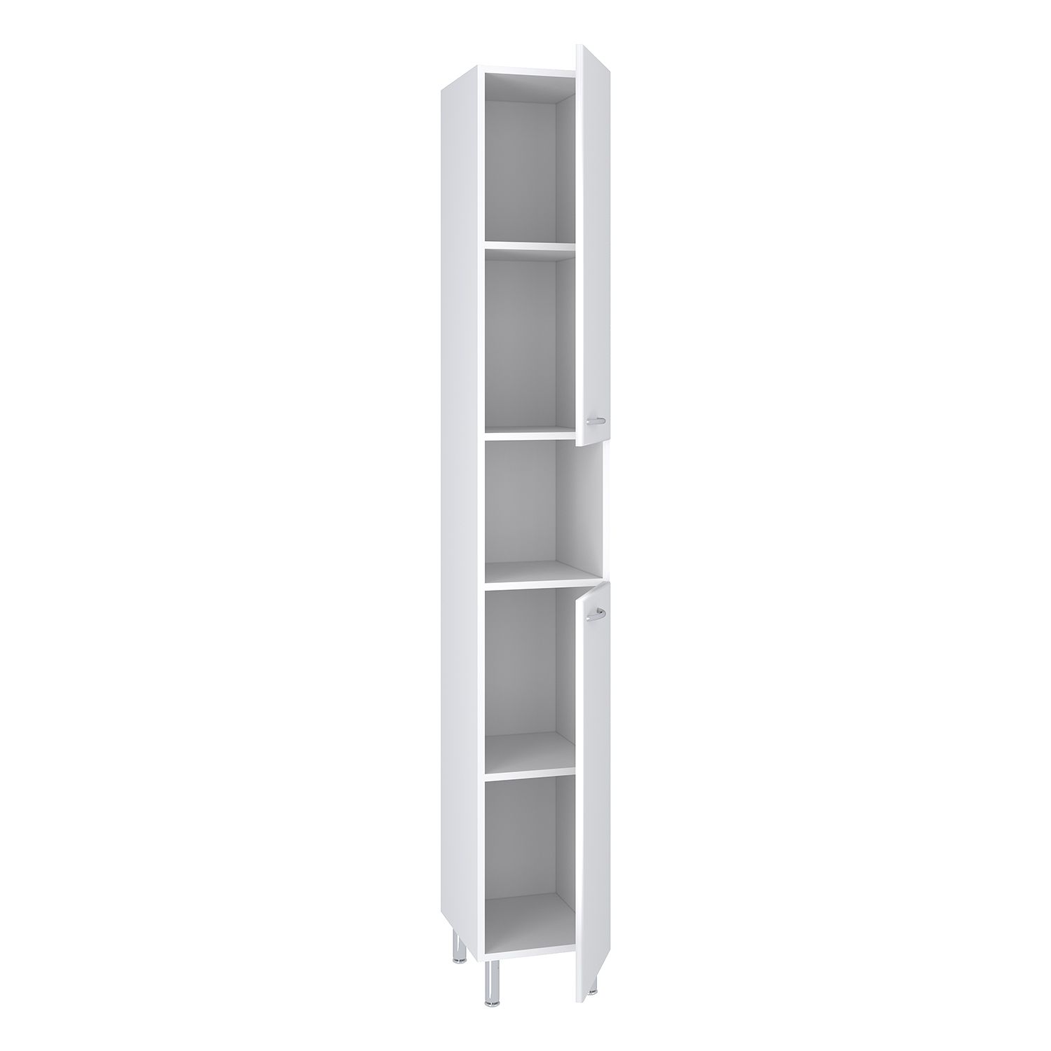Шкаф-колонна напольный с двумя распашными дверками и открытой нишей посередине. В нижнем и верхнем отделениях - по одной полке. Петли со встроенным доводчиком, ручки - 2шт, ножки хром - 2 шт, ножки пластик -2шт. Универсальный.