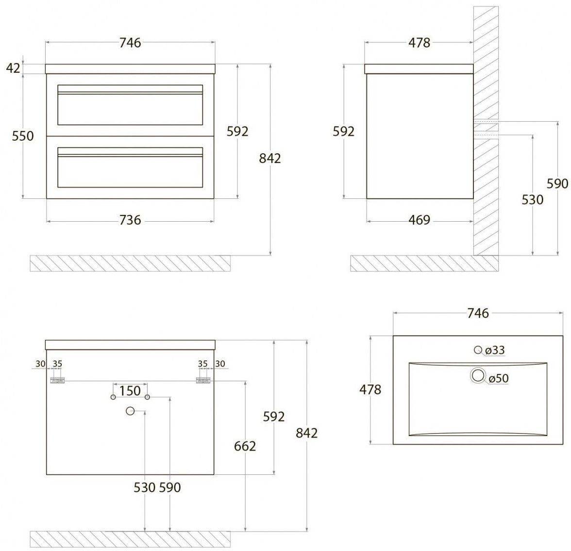 • Рекомендуемая высота от пола: 844 мм