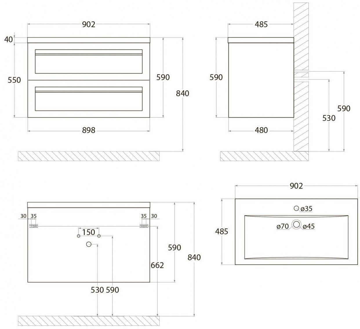 - Рекомендуемая высота от пола: 844 мм