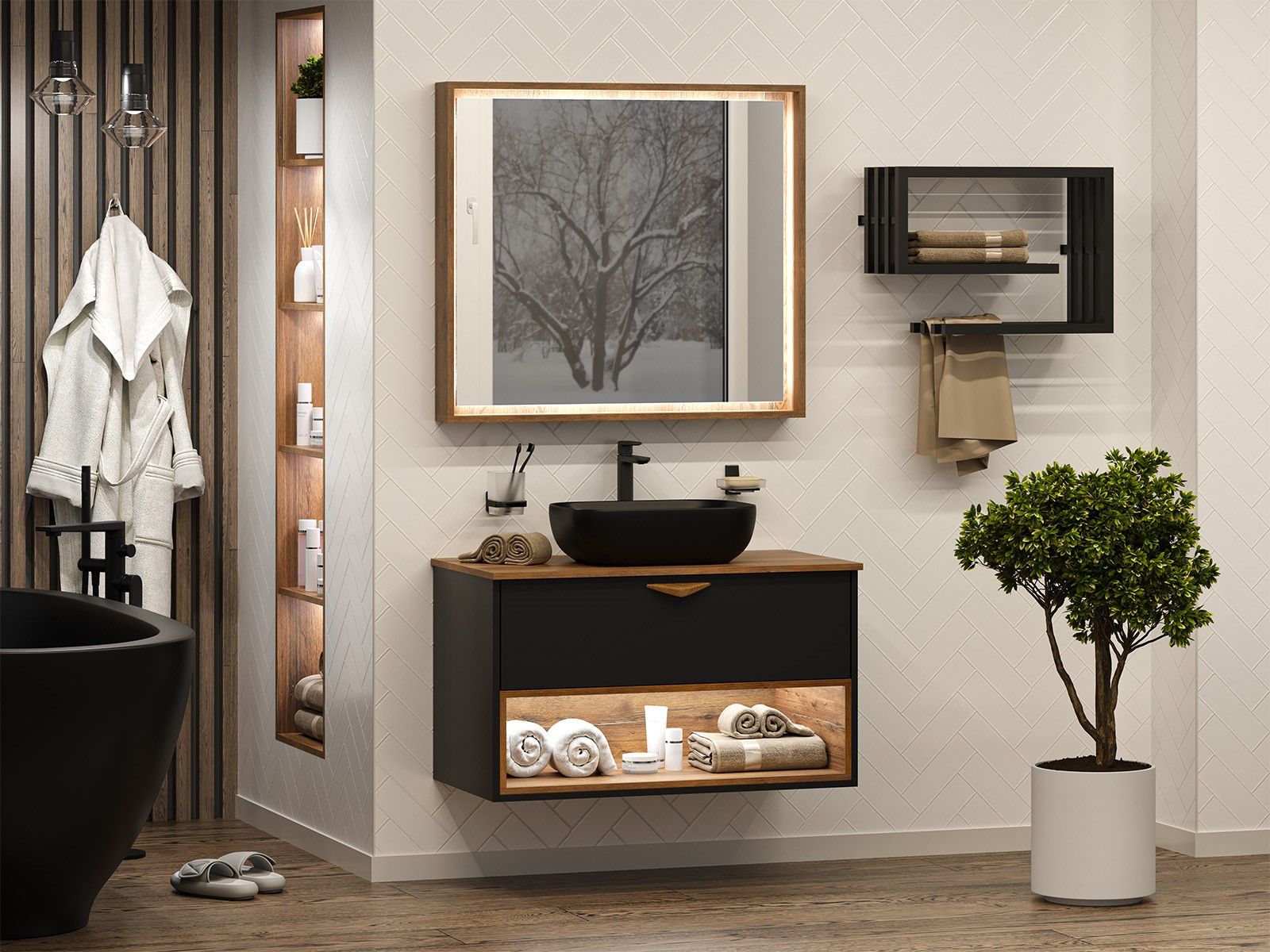 Подвесная тумба под раковину Brevita Bergen BER-07090-19-02-1Я с подсветкой 90см дуб Галифакс олово/чёрный купить