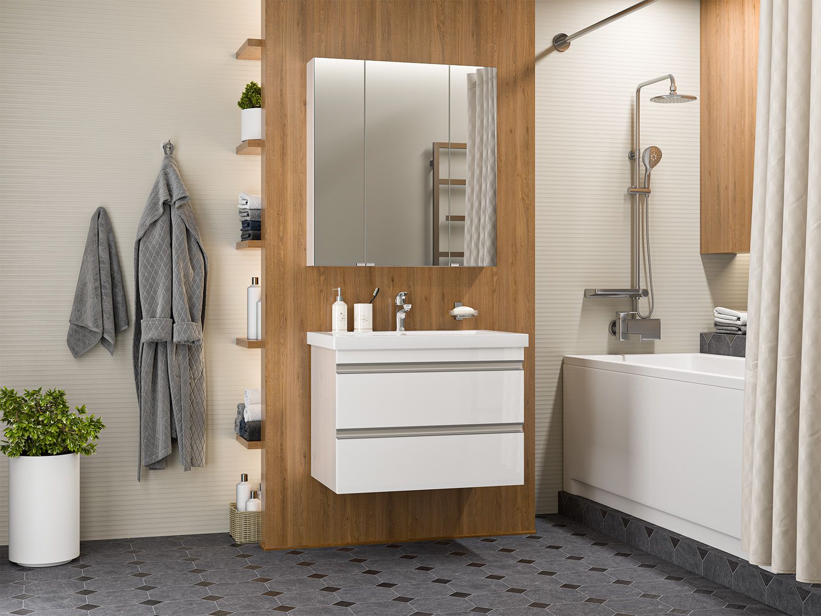 Подвесная тумба в ванную комнату – это не просто элемент мебели, а подлинный акцент в интерьере, который сочетает в себе функциональность и стиль. Она придаёт помещению лёгкость и воздушность, освобождая пространство на полу и создавая иллюзию большего объёма.Функциональные особенности таких тумб варьируются от наличия выдвижных ящиков до встроенных систем хранения, которые помогают организовать пространство ванной комнаты. Важным аспектом является также возможность выбора различных цветовых решений и отделок, что позволяет гармонично вписать тумбу в любой интерьер – от классического до ультрасовременного.С помощью подвесной тумбы ванная комната становится не только более удобной, но и эстетически привлекательной, создавая атмосферу уюта и роскоши.