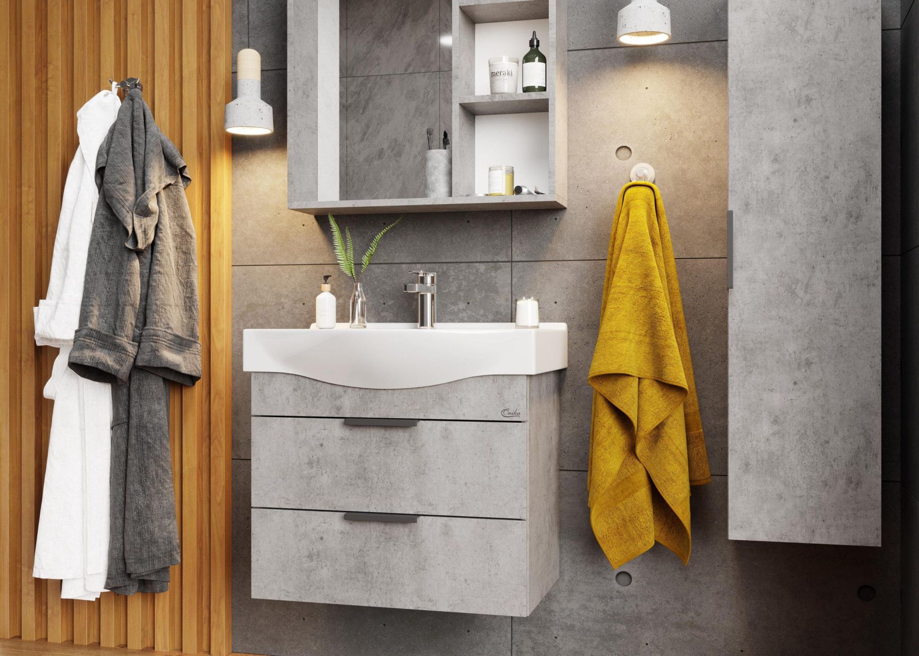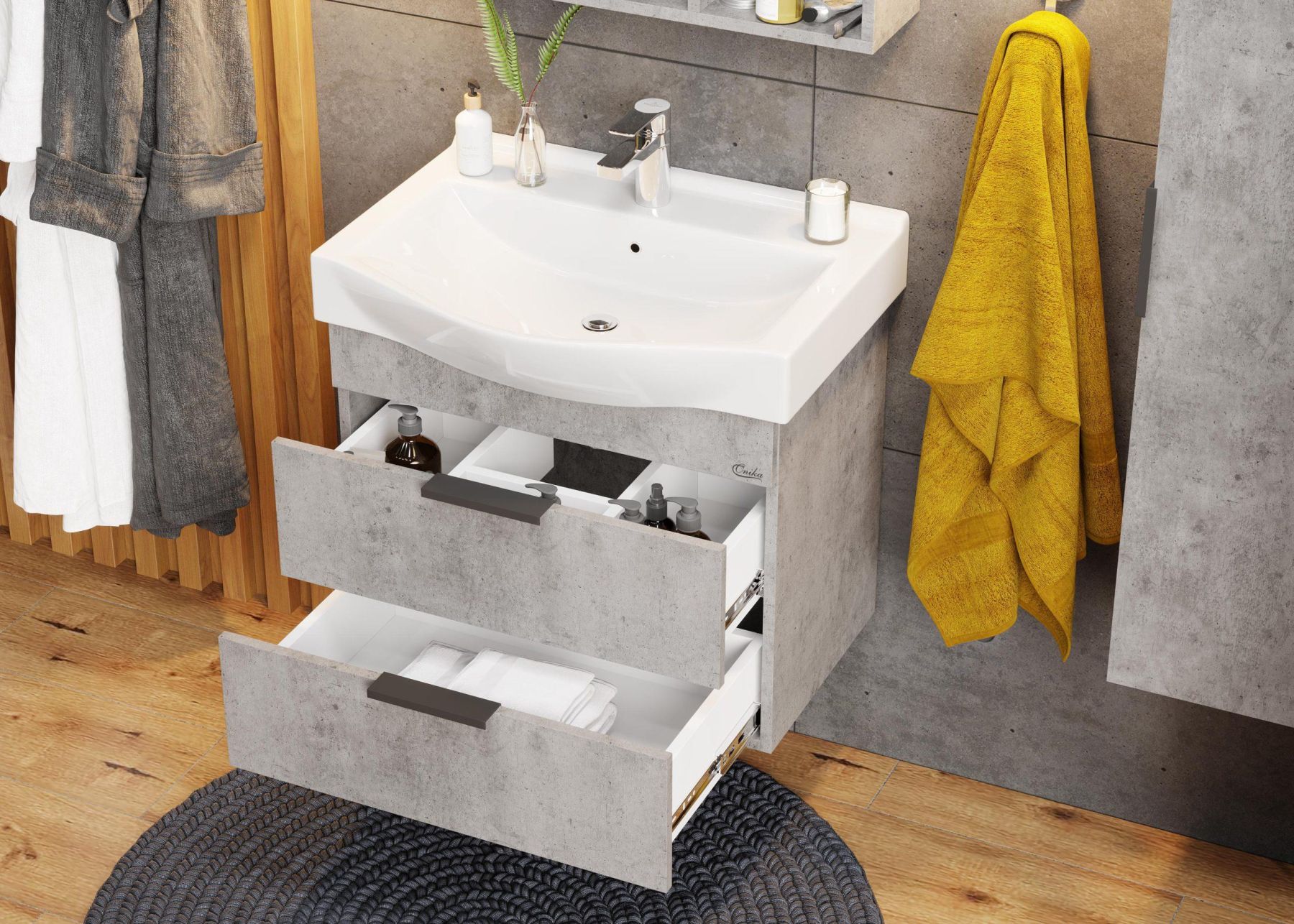 Подвесная тумба для ванной комнаты Onika Девис 65 отличается чёткой геометрией форм и создана для тех, кто ценит современный лаконичный дизайн, холодный брутальный эффект бетона, а также безупречное исполнение.