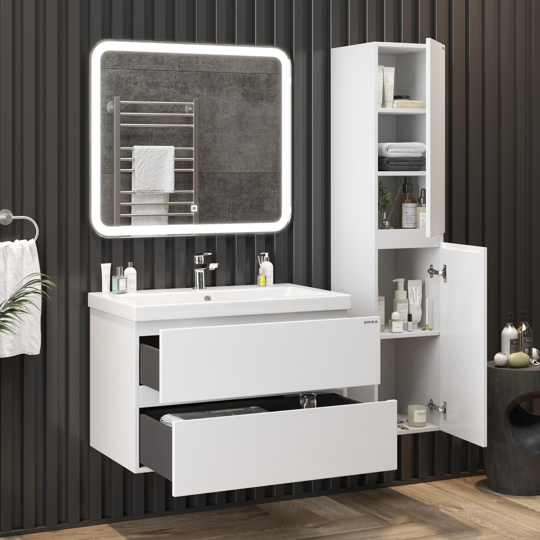 Подвесная конструкция значительно упрощает процесс уборки в ванной комнате, а ручки, изящно интегрированные в фасады, позволяют сделать эксплуатацию более удобной и практичной.