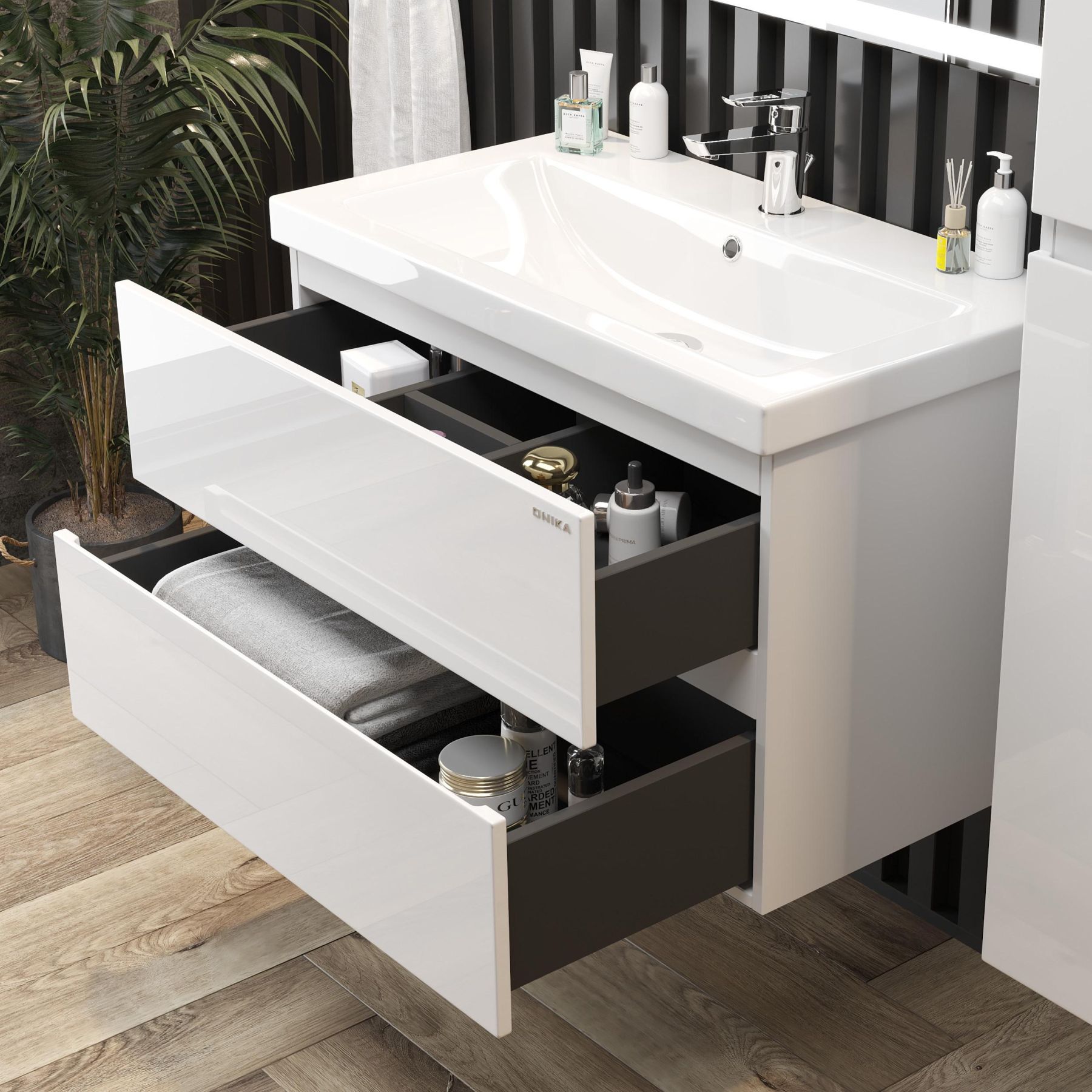 Два вместительных ящика с направляющими скрытого монтажа с доводчиками помогут организовать пространство в ванной комнате и компактно разместить необходимые вещи.