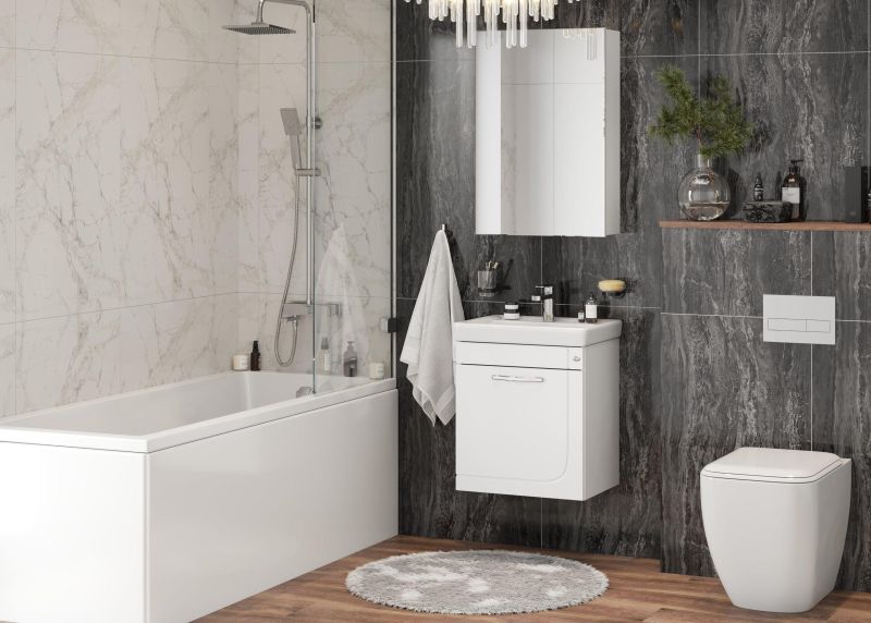 Подвесная конструкция и компактные габариты подойдут для оформления небольшого пространства, а простой дизайн с изящной фрезеровкой и сверкающей дизайнерской ручкой гармонично впишется в любую ванную комнату.