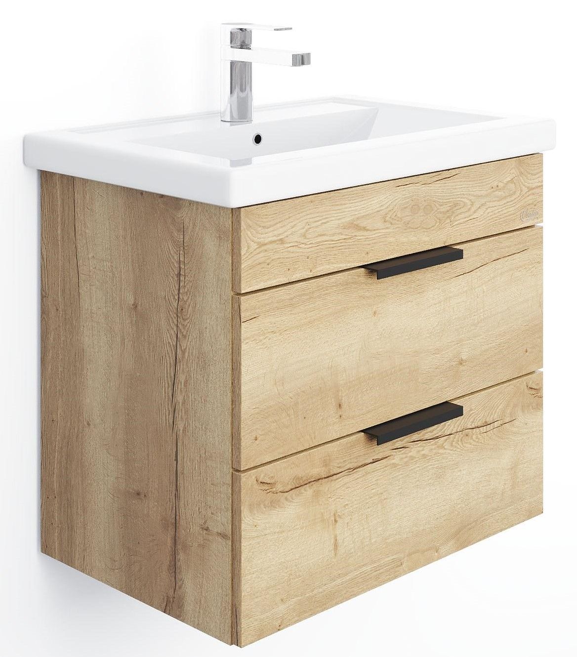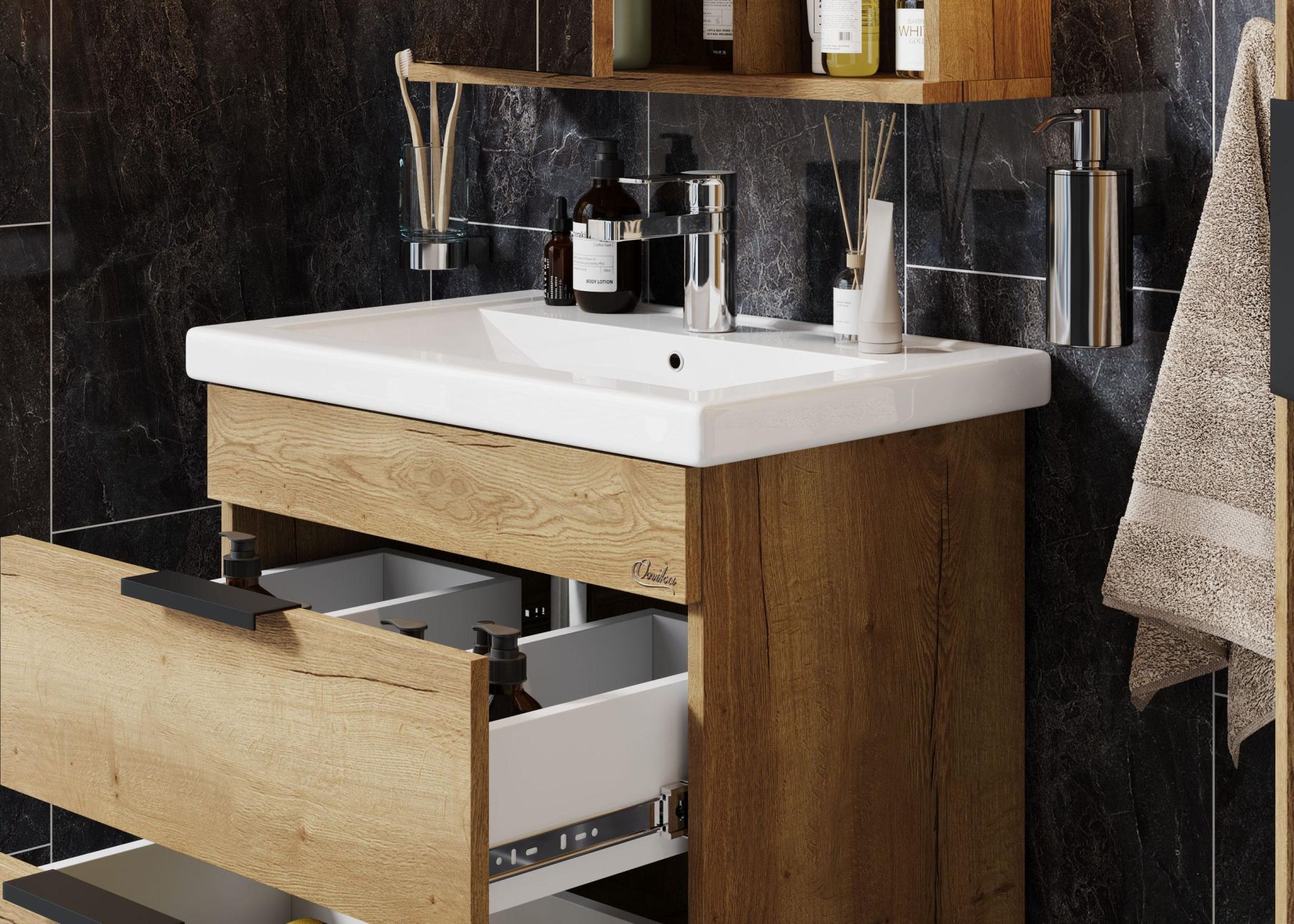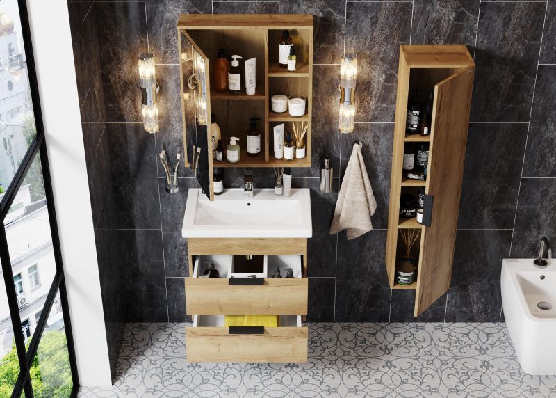 Подвесная тумба для ванной комнаты Onika Легран 50 - это сочетание насыщенного древесного декора и благородства металла: роскошная текстура и натуральный цвет дуба дают теплоту, а матовые металлические ручки добавляют урбанизма и солидности.