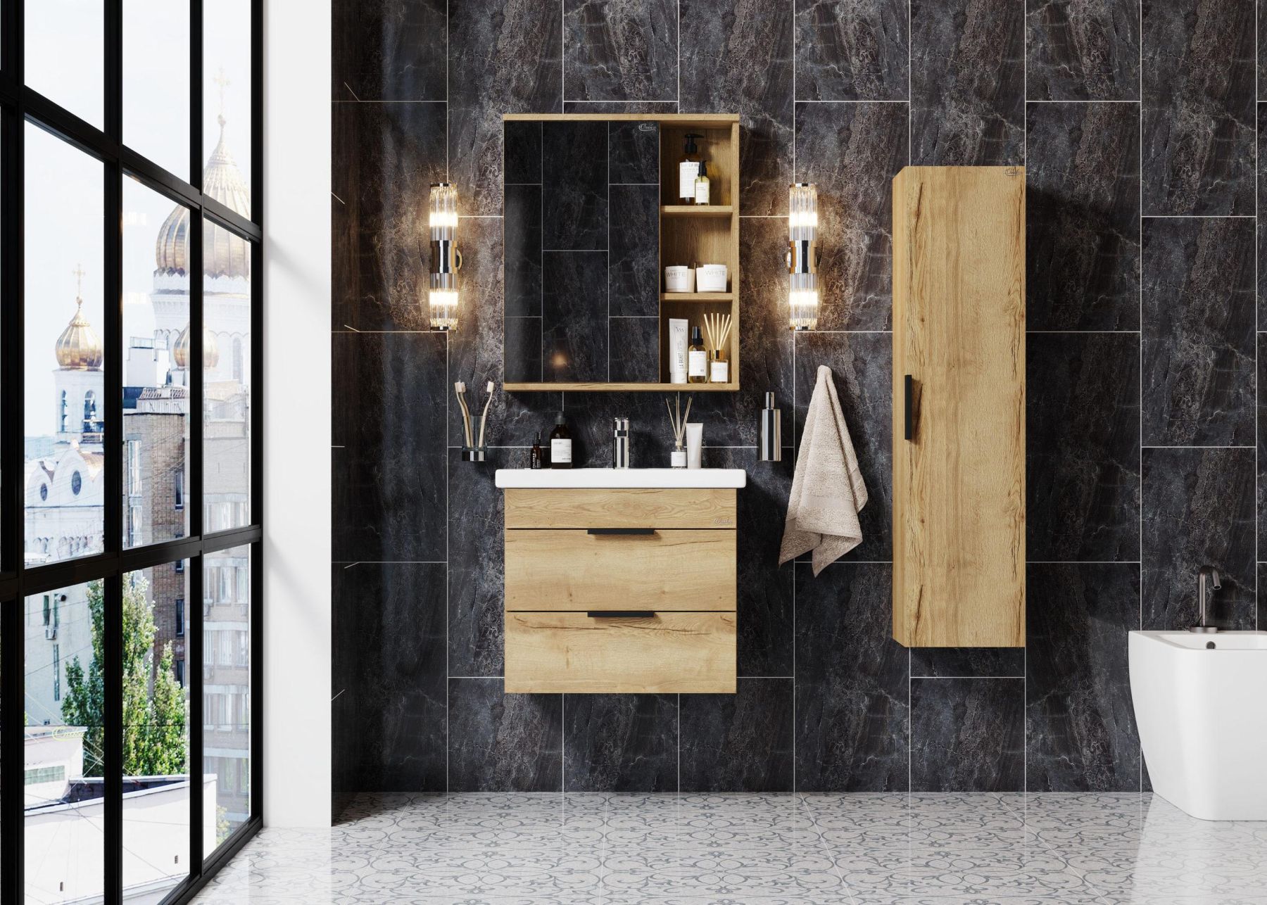 Подвесная тумба для ванной комнаты Onika Легран 60 - это сочетание насыщенного древесного декора и благородства металла: роскошная текстура и натуральный цвет дуба дают теплоту, а матовые металлические ручки добавляют урбанизма и солидности.