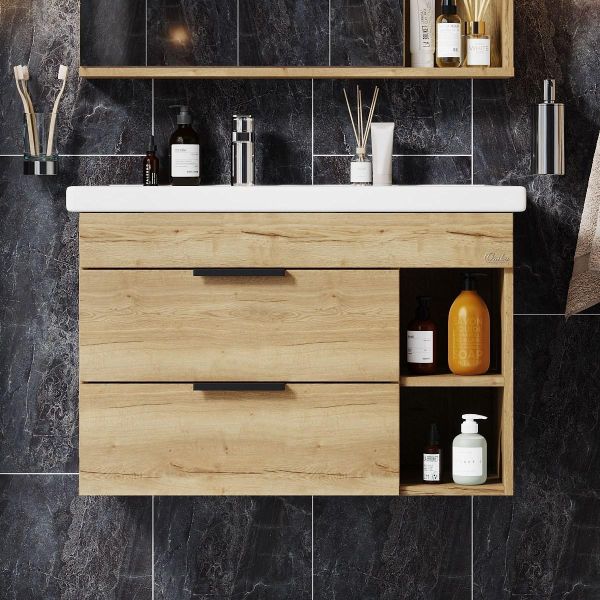 Подвесная тумба для ванной комнаты Onika Легран 80 - это сочетание насыщенного древесного декора и благородства металла: роскошная текстура и натуральный цвет дуба дают теплоту, а матовые металлические ручки добавляют урбанизма и солидности.