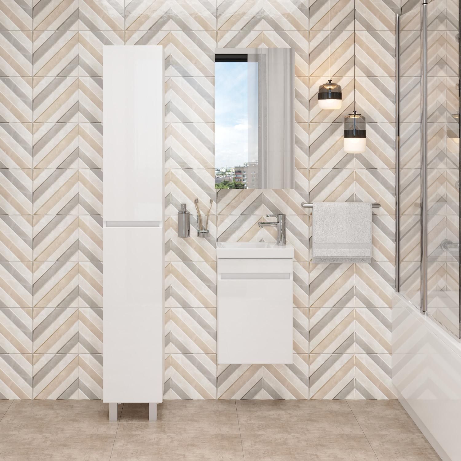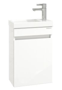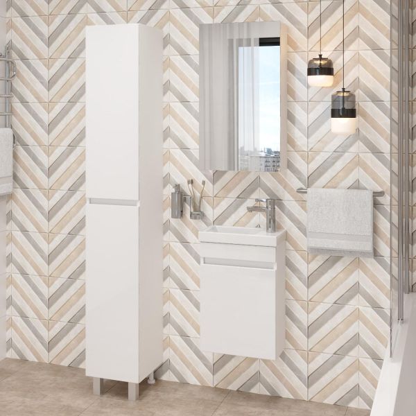 Тумба имеет белый глянцевый фасад и строгие формы без декора. За дверцей с интегрированной ручкой скрывается пространство с полкой для размещения необходимых бытовых принадлежностей.