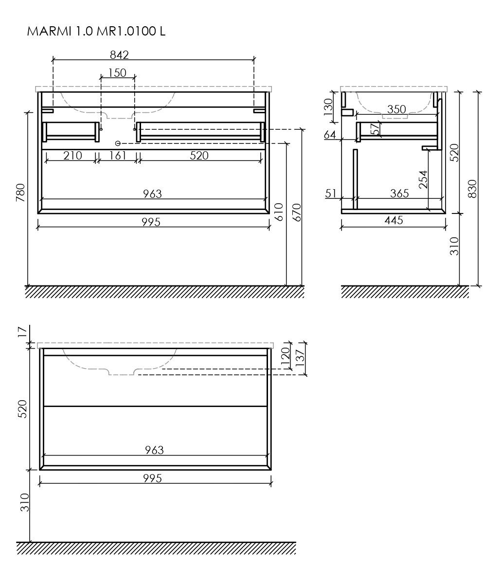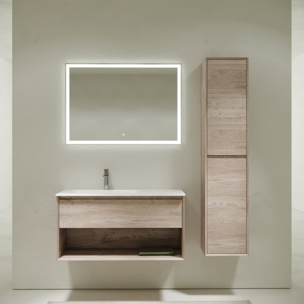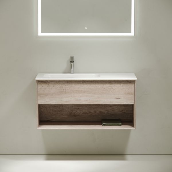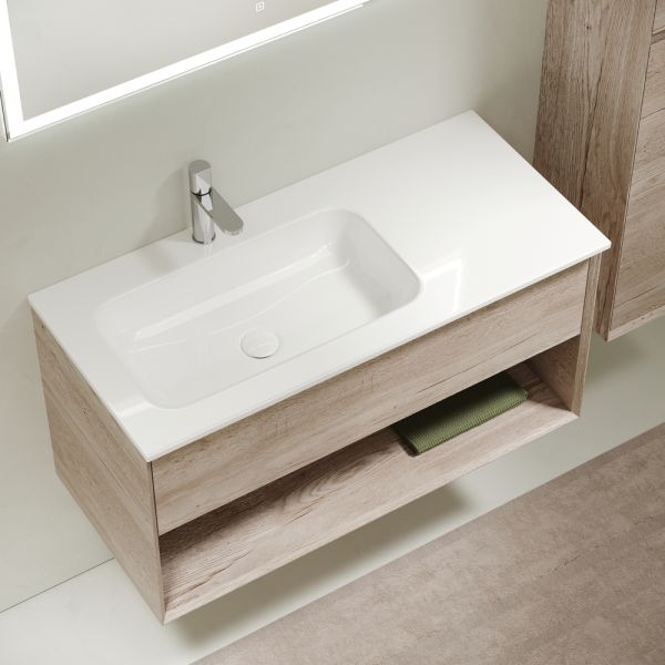 Тумба подвесная SANCOS Marmi 1.0 левая, 995х445х520, c одним ящиком оснащенным доводчиками скрытого монтажа с системой Soft close (плавного закрывания) и открытой нишей, c фрезерованной ручкой по всей длине фасада, дуб галифакс натуральный, арт. MR1.0100LEG