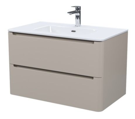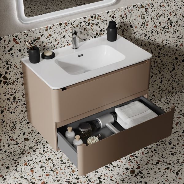Подвесная тумба с плоским умывальником Edifice в теплом оттенке капучино – воплощение современного минимализма. Мягкие линии корпуса в сочетании с удобными интегрированными ручками выглядят свежо и актуально. Смотрится аккуратно, легко и не усложняет процесс уборки в ванной благодаря подвесной конструкции.