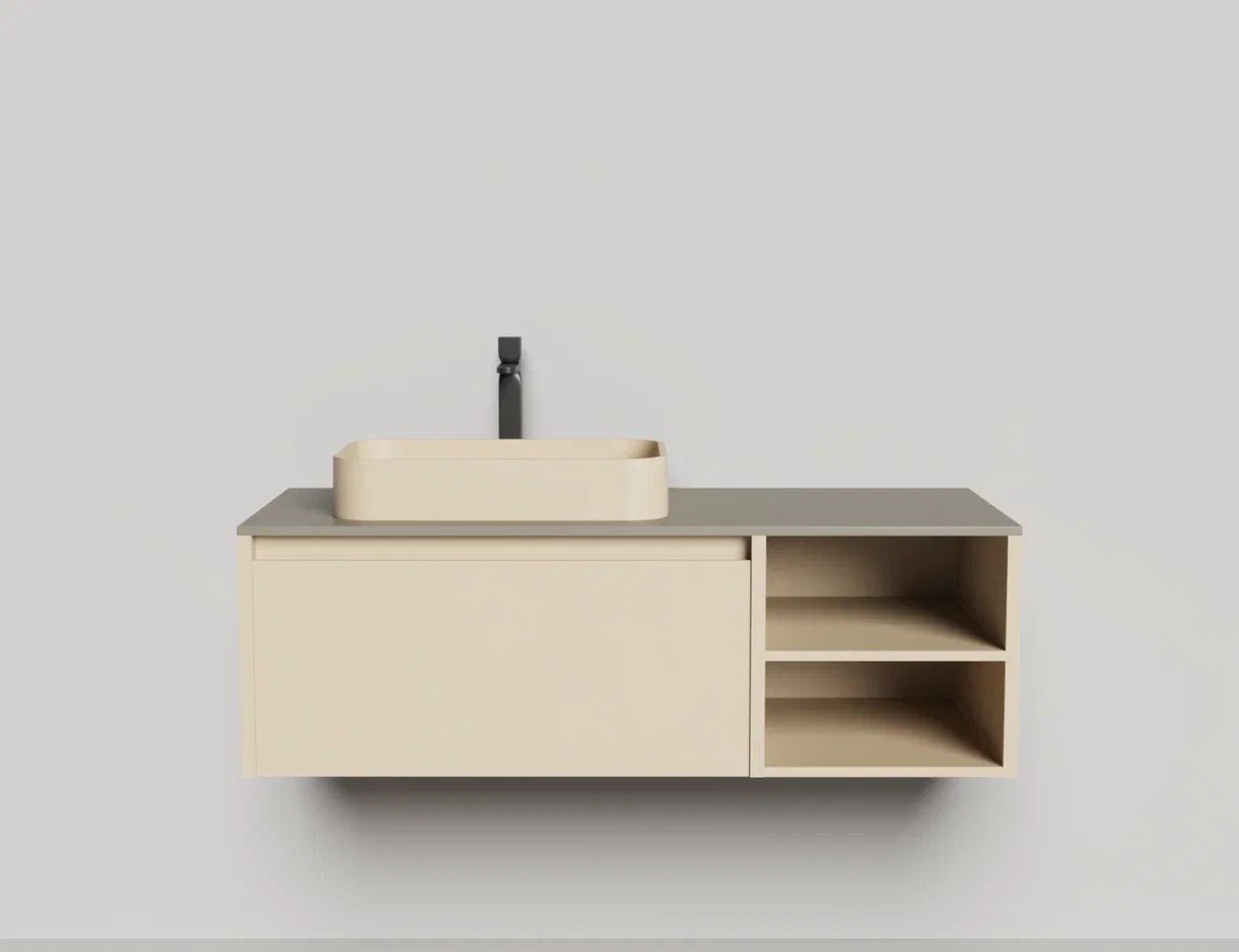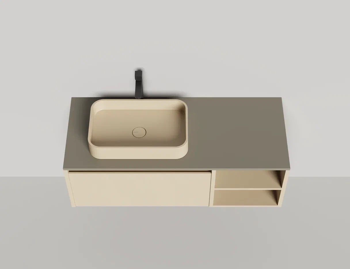 - Тумба и столешница из материала S-Stone в сборе (накладные раковины укомплектованы донным клапаном и поставляются в отдельной коробке)