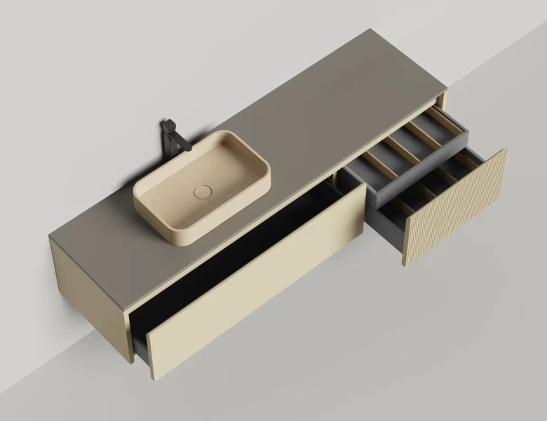 Наполнение для тумбы включает: блоки ячеек для тумб, коврики и комплект внутренней подсветки, которые помогут организовать пространство и создать более удобный доступ к вещам.Тумба DOMINO, дополненная столешницей COSTA из каменного литья S-Stone, гарантирует практичность и простоту ухода.
