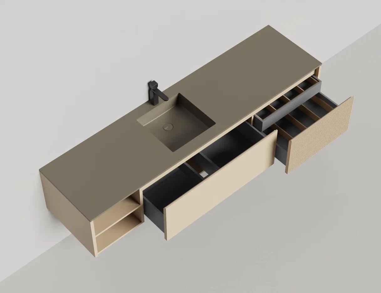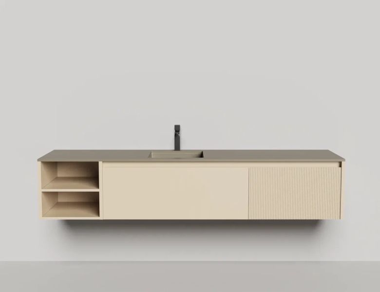 Наполнение для тумбы включает: блоки ячеек для тумб, коврики и комплект внутренней подсветки, которые помогут организовать пространство и создать более удобный доступ к вещам.Тумба DOMINO, дополненная столешницей COSTA из каменного литья S-Stone, гарантирует практичность и простоту ухода.