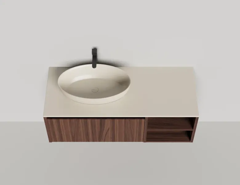 • Тумба и столешница из материала S-Stone в сборе (накладные раковины укомплектованы донным клапаном и поставляются в отдельной коробке)